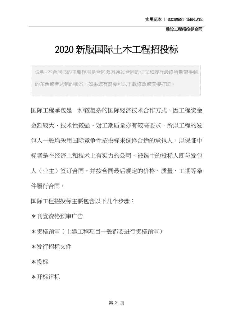 不久前,最新文档《2020新版国际土木工程招投标》全文正式在本站发布,感兴趣的用户可以下载阅读。 声明:本站所有文章,如无特殊说明或标注,均为本站原创发布。任何个人或组织,在未征得本站同意时,禁止复制、盗用、采集、发布本站内容到任何网站、书籍等各类媒体平台。如若本站内容侵犯了原著者的合法权益,可联系我们进行处理。