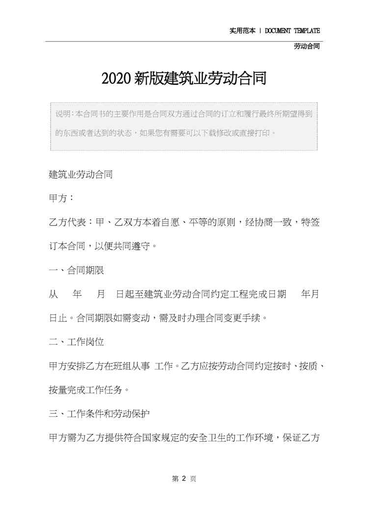 本站资深用户发布了最新的《2020新版建筑业劳动合同》文档,以下内容为预览,详细内容可下载阅读。 声明:本站所有文章,如无特殊说明或标注,均为本站原创发布。任何个人或组织,在未征得本站同意时,禁止复制、盗用、采集、发布本站内容到任何网站、书籍等各类媒体平台。如若本站内容侵犯了原著者的合法权益,可联系我们进行处理。