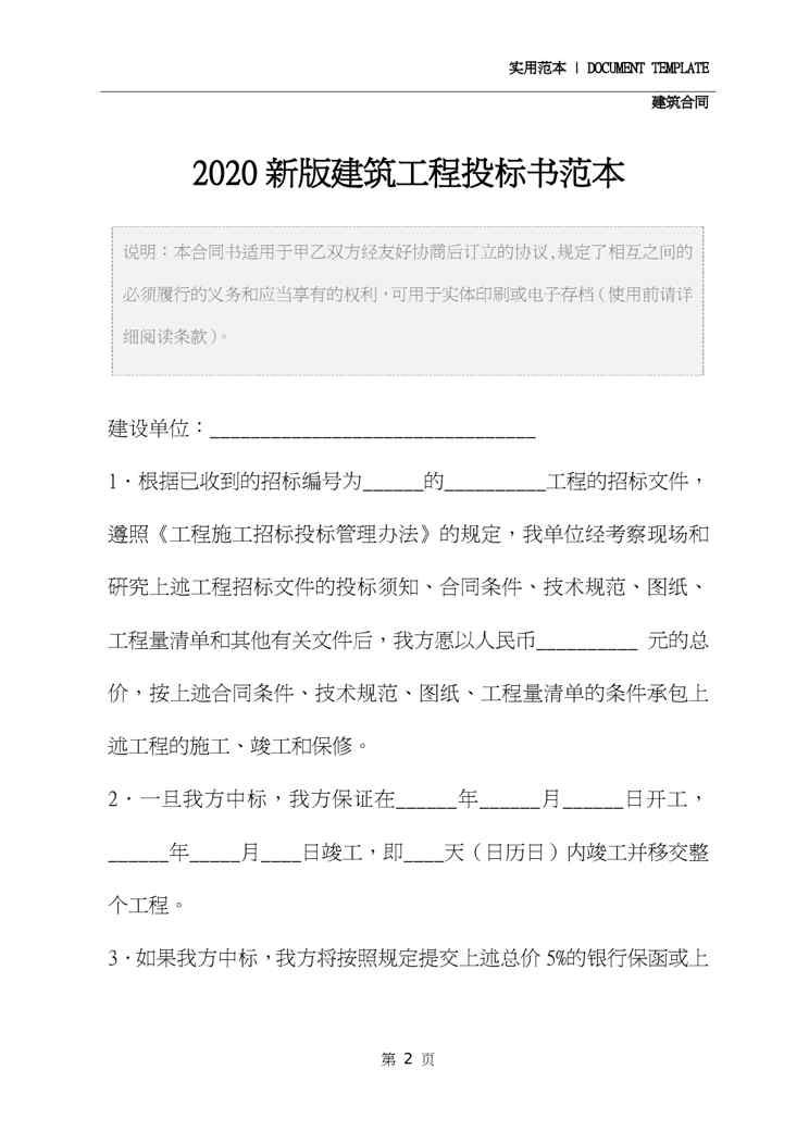 本站正式发布了《2020新版建筑工程投标书范本》文档,文档详细内容可下载阅读。 声明:本站所有文章,如无特殊说明或标注,均为本站原创发布。任何个人或组织,在未征得本站同意时,禁止复制、盗用、采集、发布本站内容到任何网站、书籍等各类媒体平台。如若本站内容侵犯了原著者的合法权益,可联系我们进行处理。