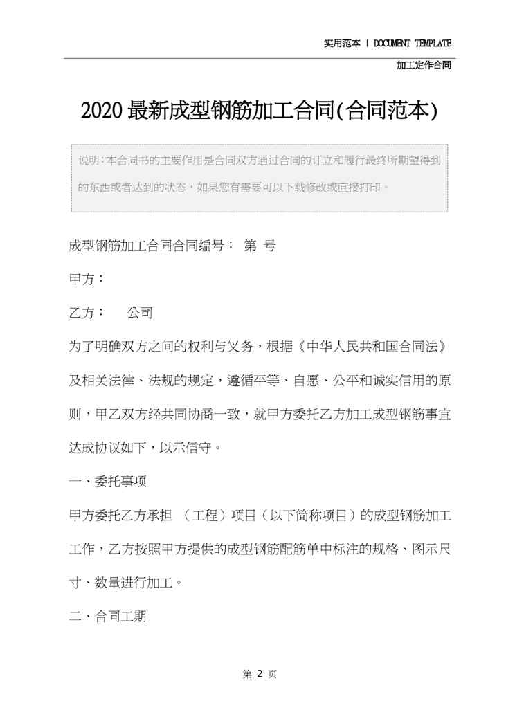 本站资深用户发布了最新的《2020最新成型钢筋加工合同(合同范本)》文档,以下内容为预览,详细内容可下载阅读。 声明:本站所有文章,如无特殊说明或标注,均为本站原创发布。任何个人或组织,在未征得本站同意时,禁止复制、盗用、采集、发布本站内容到任何网站、书籍等各类媒体平台。如若本站内容侵犯了原著者的合法权益,可联系我们进行处理。