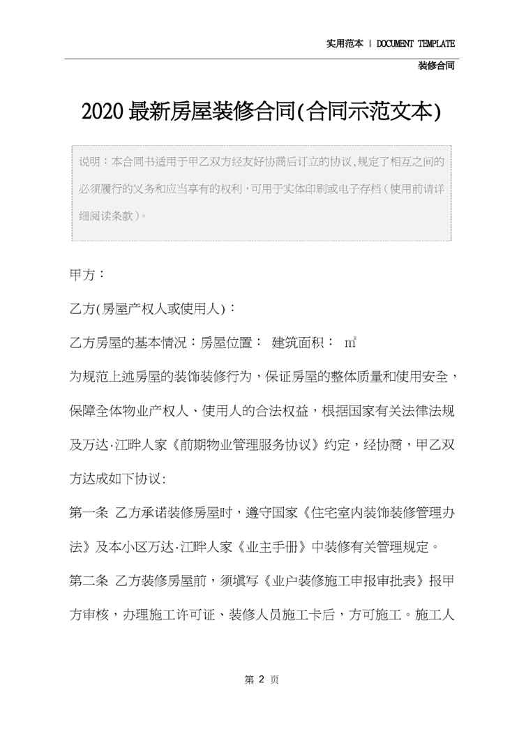 不久前,最新文档《2020最新房屋装修合同(合同示范文本)》全文正式在本站发布,感兴趣的用户可以下载阅读。 声明:本站所有文章,如无特殊说明或标注,均为本站原创发布。任何个人或组织,在未征得本站同意时,禁止复制、盗用、采集、发布本站内容到任何网站、书籍等各类媒体平台。如若本站内容侵犯了原著者的合法权益,可联系我们进行处理。