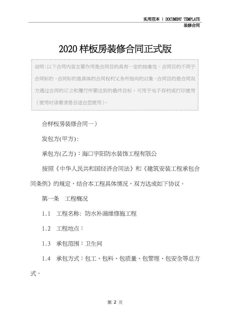本站资深用户发布了最新的《2020样板房装修合同正式版》文档,以下内容为预览,详细内容可下载阅读。 声明:本站所有文章,如无特殊说明或标注,均为本站原创发布。任何个人或组织,在未征得本站同意时,禁止复制、盗用、采集、发布本站内容到任何网站、书籍等各类媒体平台。如若本站内容侵犯了原著者的合法权益,可联系我们进行处理。