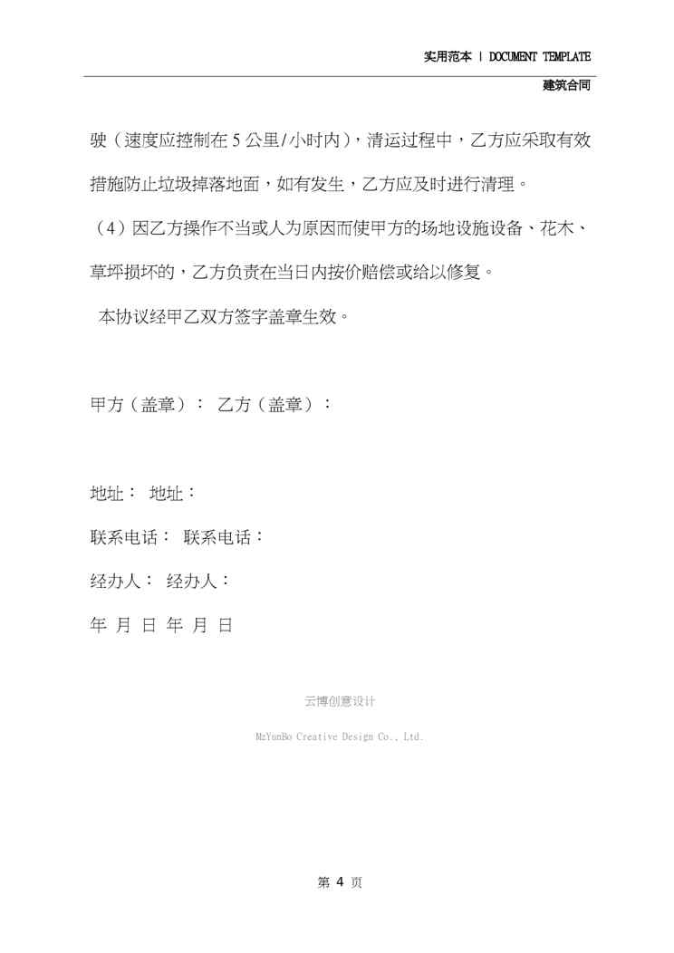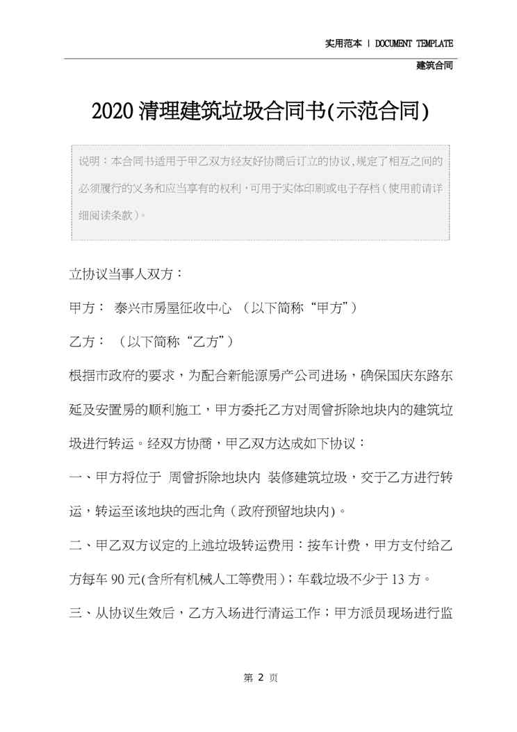 本站资深用户发布了最新的《2020清理建筑垃圾合同书(示范合同)》文档,以下内容为预览,详细内容可下载阅读。 声明:本站所有文章,如无特殊说明或标注,均为本站原创发布。任何个人或组织,在未征得本站同意时,禁止复制、盗用、采集、发布本站内容到任何网站、书籍等各类媒体平台。如若本站内容侵犯了原著者的合法权益,可联系我们进行处理。