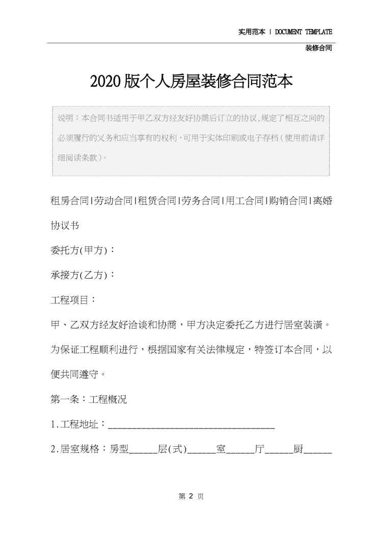 本站资深用户发布了最新的《2020版个人房屋装修合同范本》文档,以下内容为预览,详细内容可下载阅读。 声明:本站所有文章,如无特殊说明或标注,均为本站原创发布。任何个人或组织,在未征得本站同意时,禁止复制、盗用、采集、发布本站内容到任何网站、书籍等各类媒体平台。如若本站内容侵犯了原著者的合法权益,可联系我们进行处理。