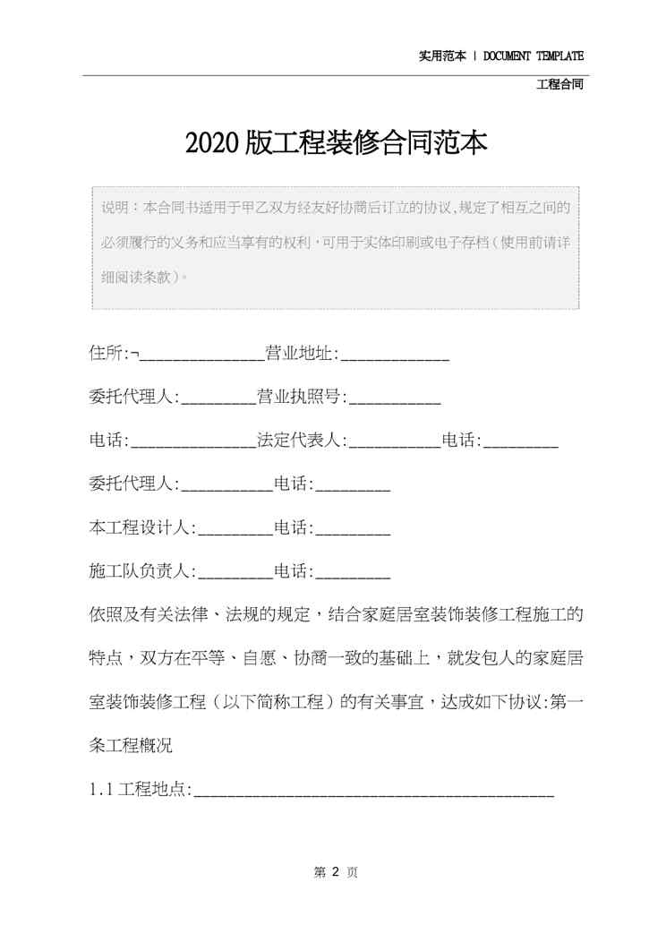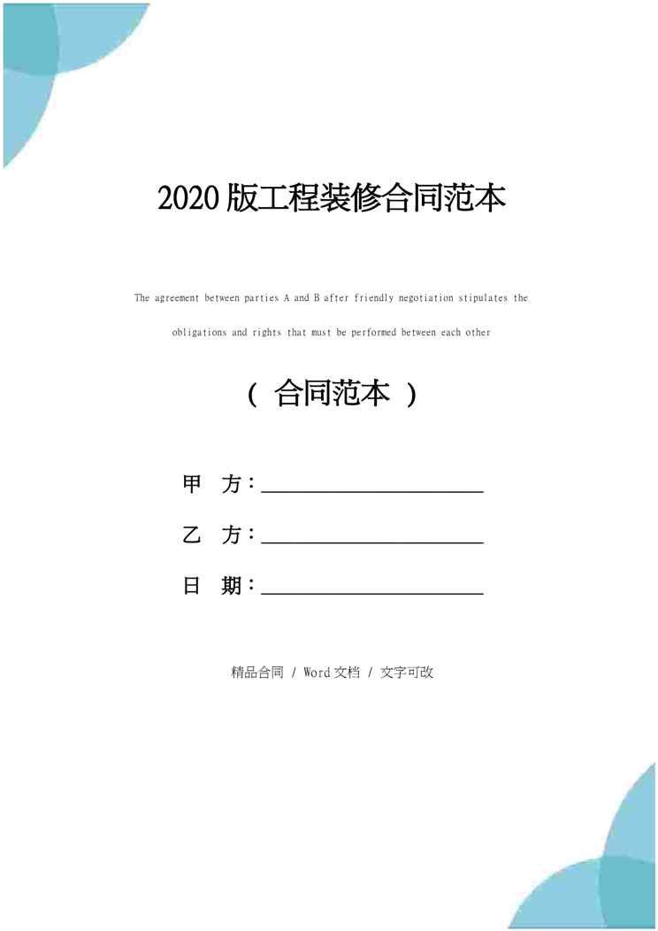 本站资深用户发布了最新的《2020版工程装修合同范本》文档,以下内容为预览,详细内容可下载阅读。 声明:本站所有文章,如无特殊说明或标注,均为本站原创发布。任何个人或组织,在未征得本站同意时,禁止复制、盗用、采集、发布本站内容到任何网站、书籍等各类媒体平台。如若本站内容侵犯了原著者的合法权益,可联系我们进行处理。