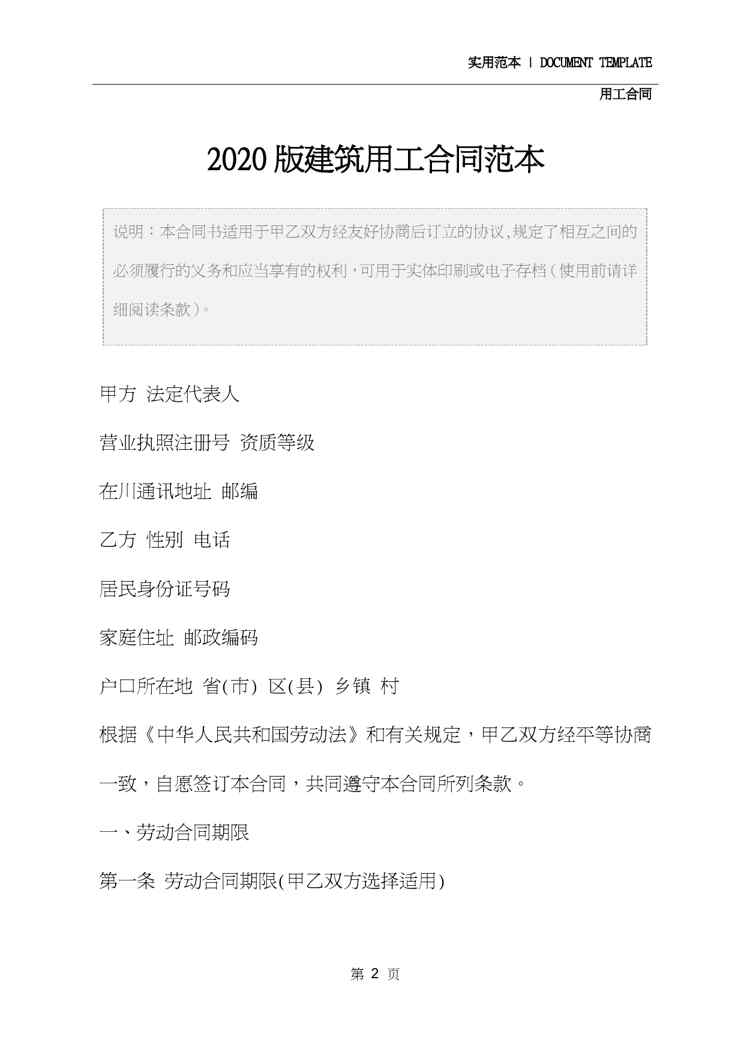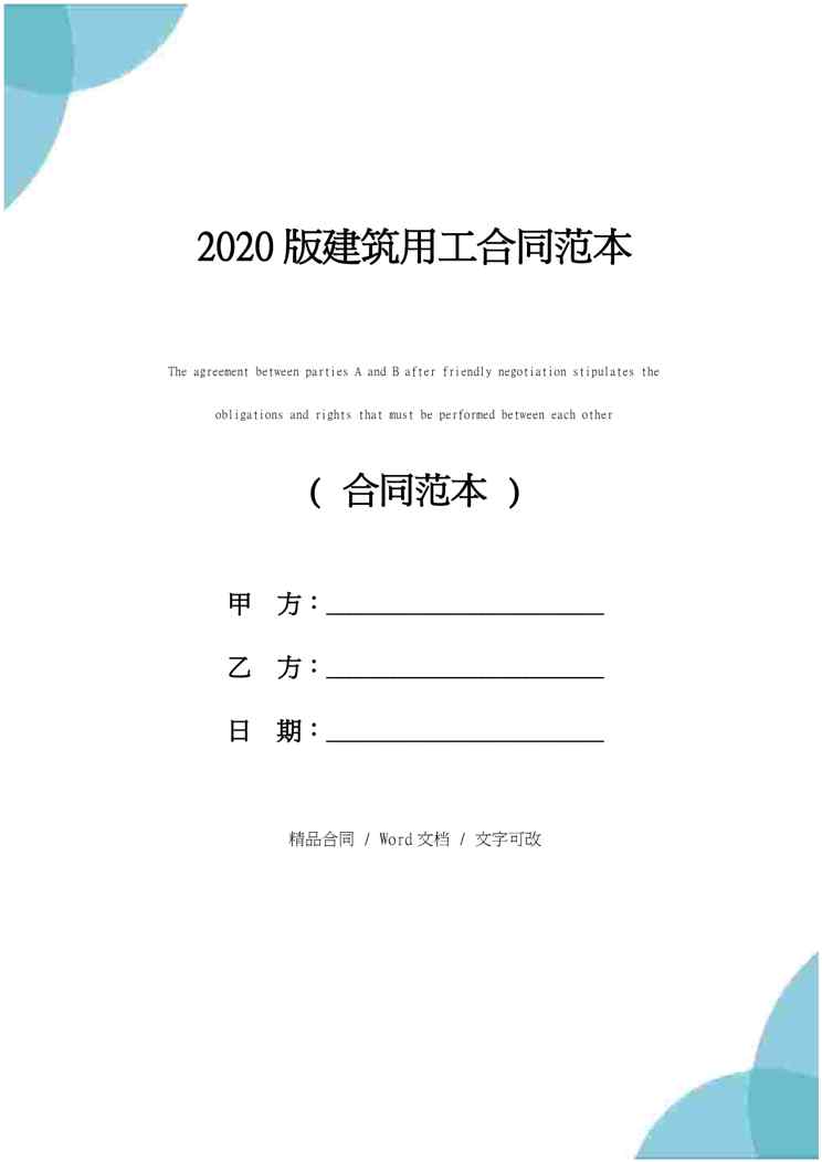 本站正式发布了《2020版建筑用工合同范本》文档,文档详细内容可下载阅读。 声明:本站所有文章,如无特殊说明或标注,均为本站原创发布。任何个人或组织,在未征得本站同意时,禁止复制、盗用、采集、发布本站内容到任何网站、书籍等各类媒体平台。如若本站内容侵犯了原著者的合法权益,可联系我们进行处理。
