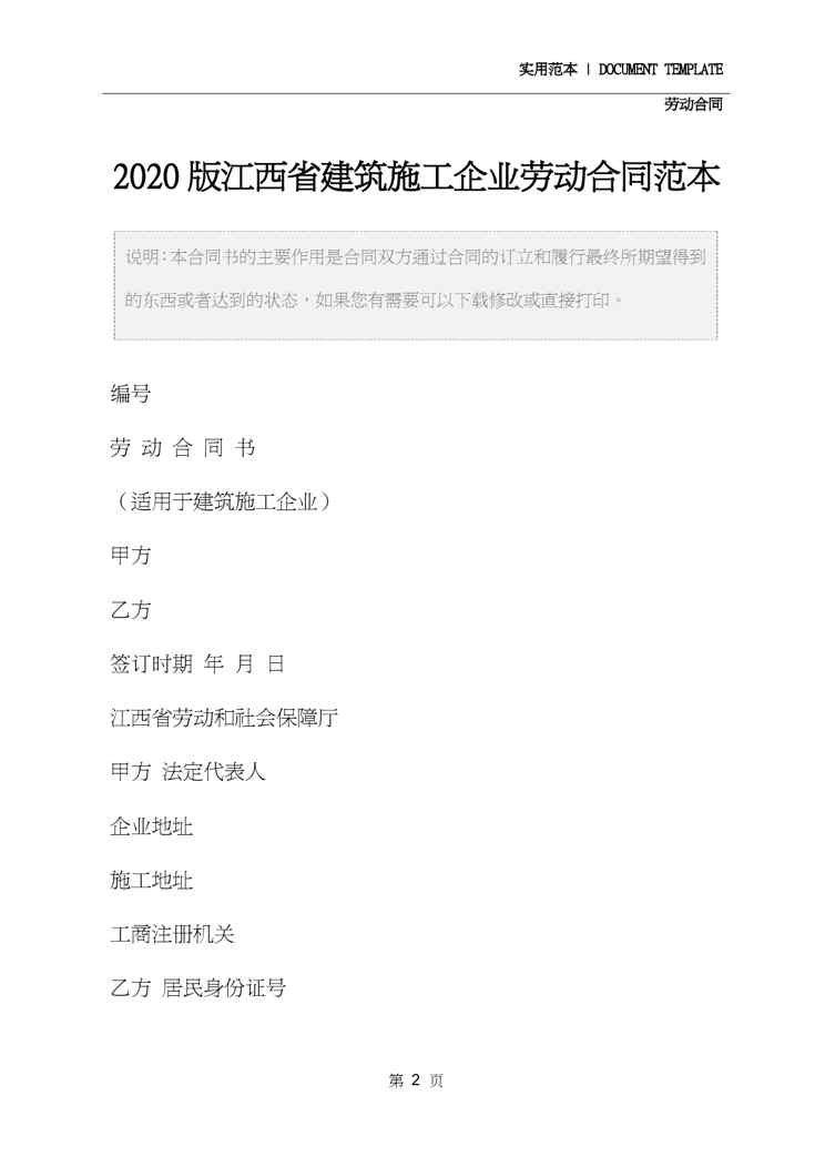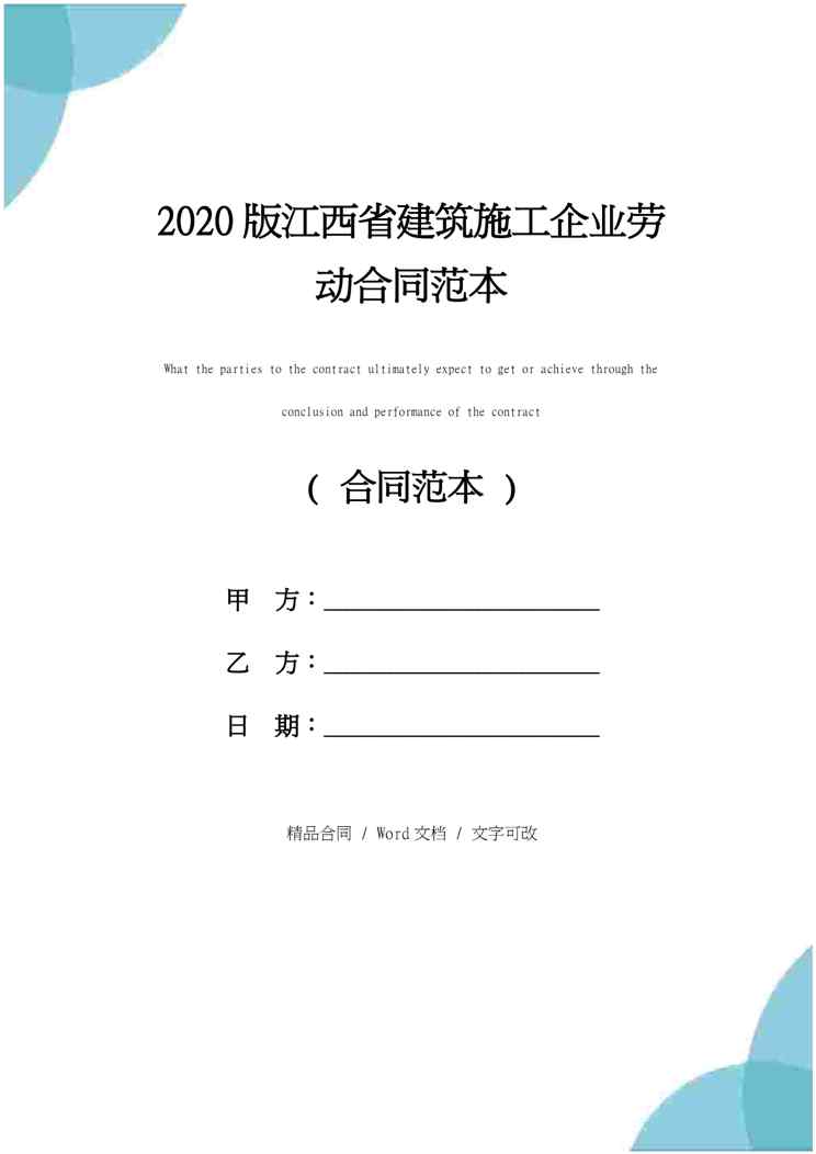 本站正式发布了《2020版江西省建筑施工企业劳动合同范本》文档,文档详细内容可下载阅读。 声明:本站所有文章,如无特殊说明或标注,均为本站原创发布。任何个人或组织,在未征得本站同意时,禁止复制、盗用、采集、发布本站内容到任何网站、书籍等各类媒体平台。如若本站内容侵犯了原著者的合法权益,可联系我们进行处理。