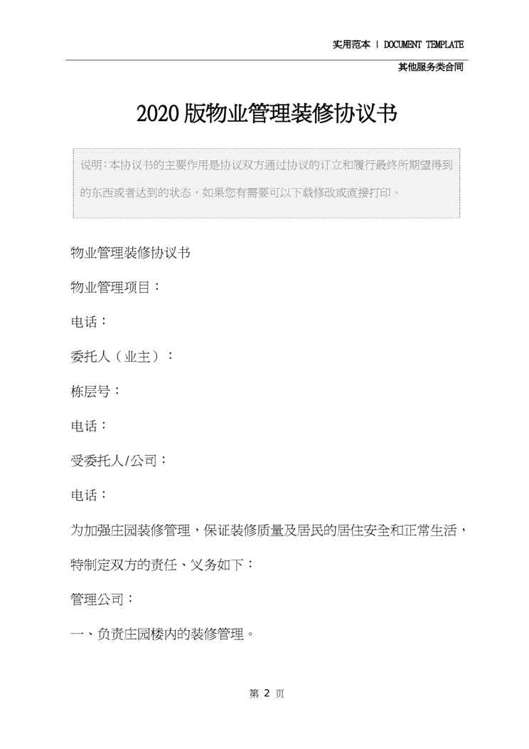 本站正式发布了《2020版物业管理装修协议书》文档,文档详细内容可下载阅读。 声明:本站所有文章,如无特殊说明或标注,均为本站原创发布。任何个人或组织,在未征得本站同意时,禁止复制、盗用、采集、发布本站内容到任何网站、书籍等各类媒体平台。如若本站内容侵犯了原著者的合法权益,可联系我们进行处理。