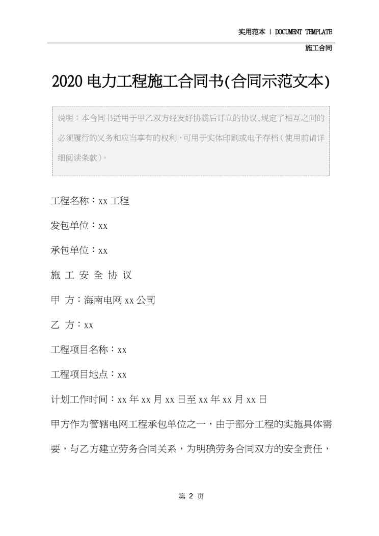 不久前,最新文档《2020电力工程施工合同书(合同示范文本)》全文正式在本站发布,感兴趣的用户可以下载阅读。 声明:本站所有文章,如无特殊说明或标注,均为本站原创发布。任何个人或组织,在未征得本站同意时,禁止复制、盗用、采集、发布本站内容到任何网站、书籍等各类媒体平台。如若本站内容侵犯了原著者的合法权益,可联系我们进行处理。