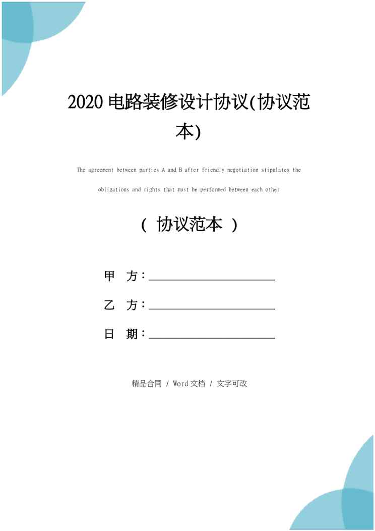 不久前,最新文档《2020电路装修设计协议(协议范本)》全文正式在本站发布,感兴趣的用户可以下载阅读。 声明:本站所有文章,如无特殊说明或标注,均为本站原创发布。任何个人或组织,在未征得本站同意时,禁止复制、盗用、采集、发布本站内容到任何网站、书籍等各类媒体平台。如若本站内容侵犯了原著者的合法权益,可联系我们进行处理。