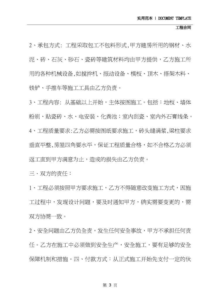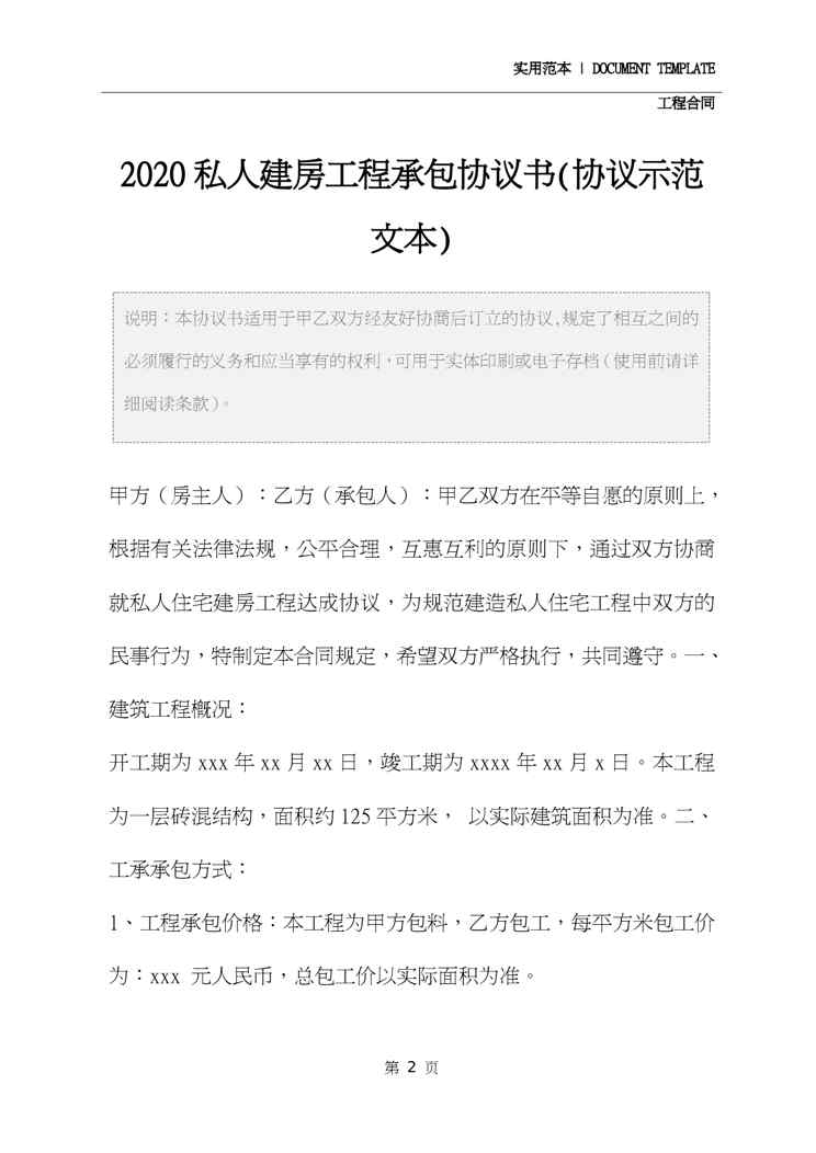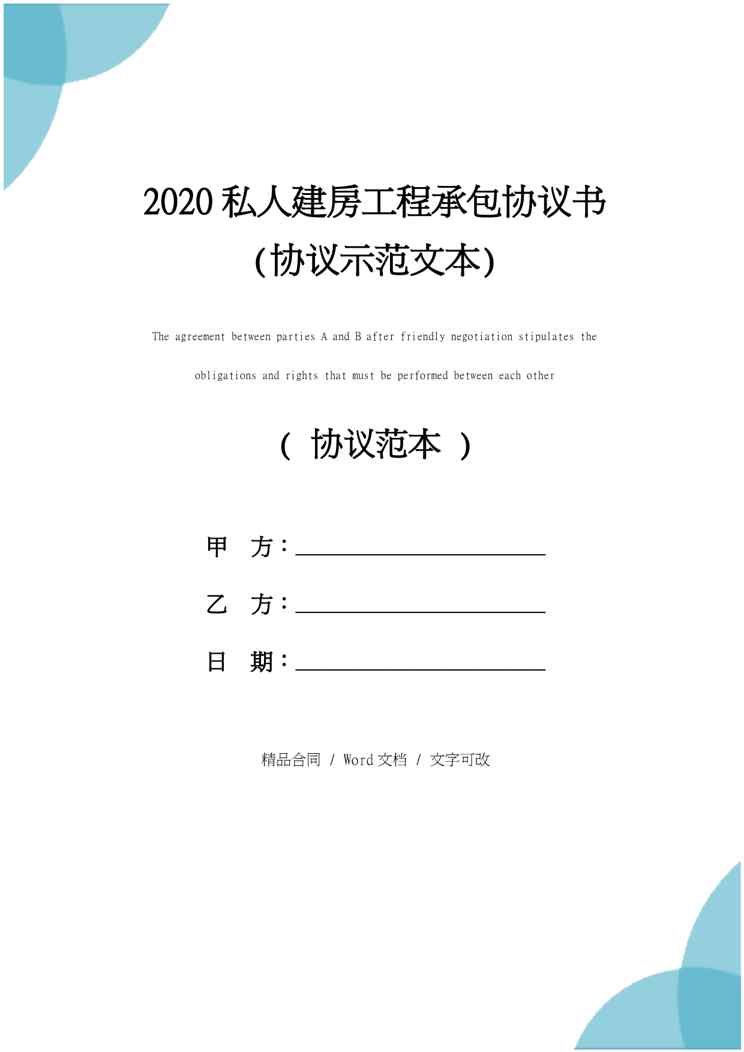 不久前,最新文档《2020私人建房工程承包协议书(协议示范文本)》全文正式在本站发布,感兴趣的用户可以下载阅读。 声明:本站所有文章,如无特殊说明或标注,均为本站原创发布。任何个人或组织,在未征得本站同意时,禁止复制、盗用、采集、发布本站内容到任何网站、书籍等各类媒体平台。如若本站内容侵犯了原著者的合法权益,可联系我们进行处理。