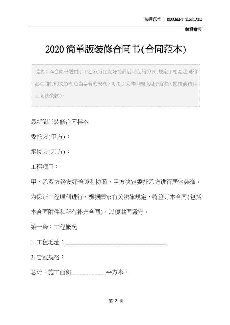 本站正式发布了《2020简单版装修合同书(合同范本)》文档,文档详细内容可下载阅读。 声明:本站所有文章,如无特殊说明或标注,均为本站原创发布。任何个人或组织,在未征得本站同意时,禁止复制、盗用、采集、发布本站内容到任何网站、书籍等各类媒体平台。如若本站内容侵犯了原著者的合法权益,可联系我们进行处理。