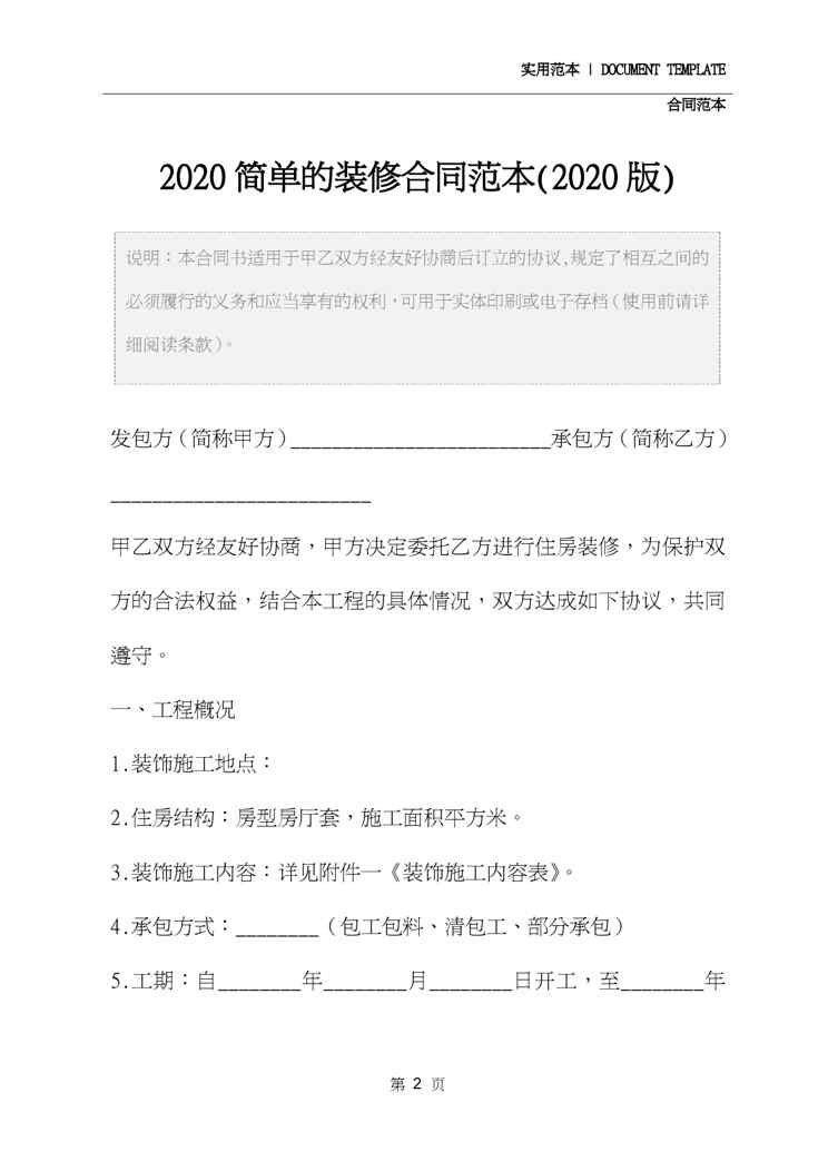 本站正式发布了《2020简单的装修合同范本(2020版)》文档,文档详细内容可下载阅读。 声明:本站所有文章,如无特殊说明或标注,均为本站原创发布。任何个人或组织,在未征得本站同意时,禁止复制、盗用、采集、发布本站内容到任何网站、书籍等各类媒体平台。如若本站内容侵犯了原著者的合法权益,可联系我们进行处理。