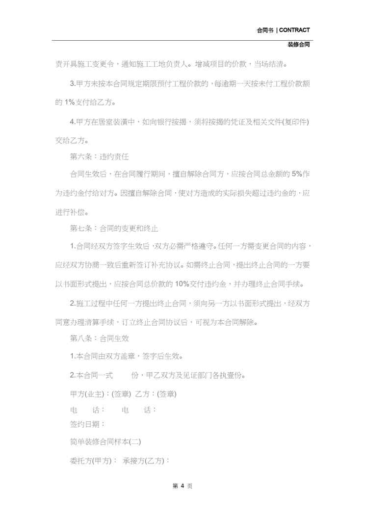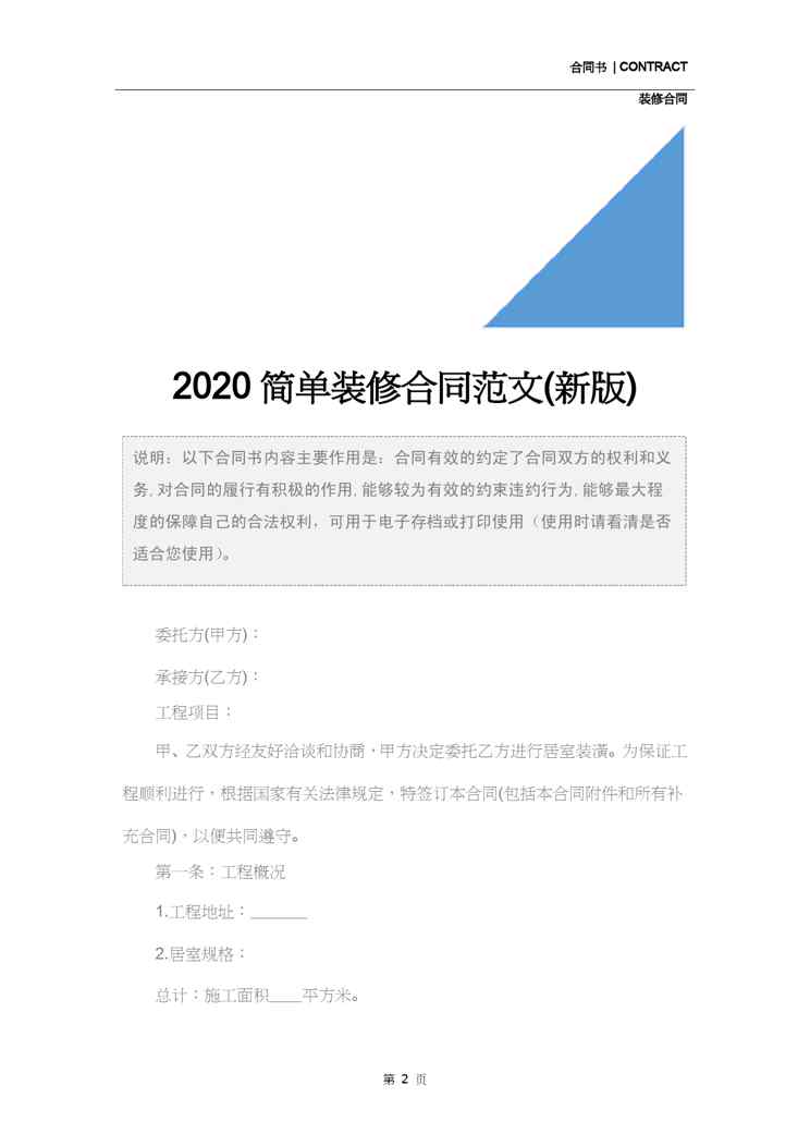 本站资深用户发布了最新的《2020简单装修合同范文(新版)》文档,以下内容为预览,详细内容可下载阅读。 声明:本站所有文章,如无特殊说明或标注,均为本站原创发布。任何个人或组织,在未征得本站同意时,禁止复制、盗用、采集、发布本站内容到任何网站、书籍等各类媒体平台。如若本站内容侵犯了原著者的合法权益,可联系我们进行处理。