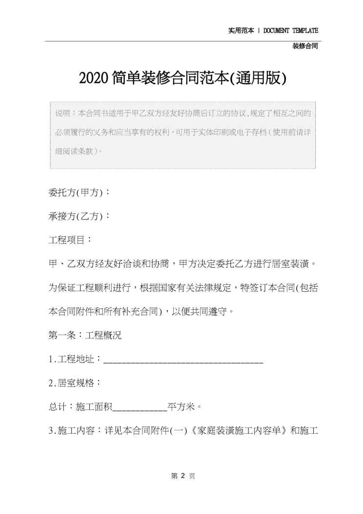 本站资深用户发布了最新的《2020简单装修合同范本(通用版)》文档,以下内容为预览,详细内容可下载阅读。 声明:本站所有文章,如无特殊说明或标注,均为本站原创发布。任何个人或组织,在未征得本站同意时,禁止复制、盗用、采集、发布本站内容到任何网站、书籍等各类媒体平台。如若本站内容侵犯了原著者的合法权益,可联系我们进行处理。