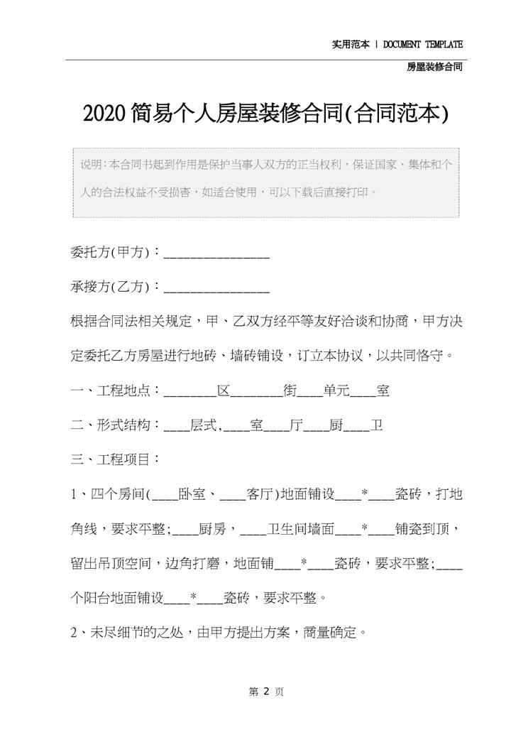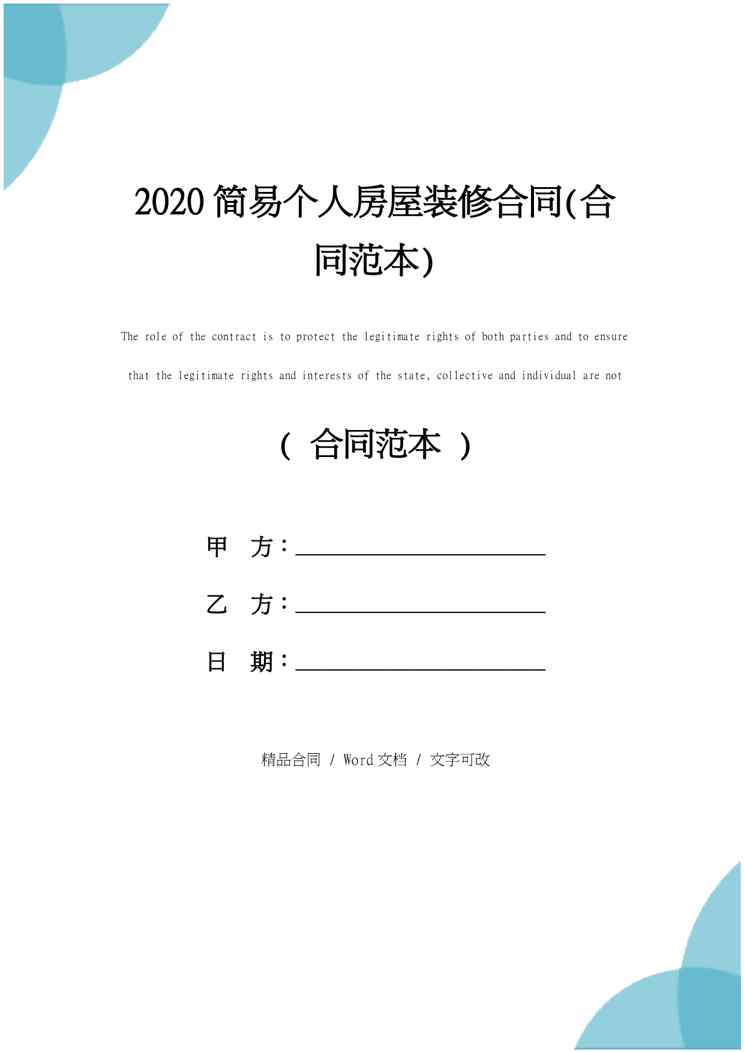 本站正式发布了《2020简易个人房屋装修合同正式版》文档,文档详细内容可下载阅读。 声明:本站所有文章,如无特殊说明或标注,均为本站原创发布。任何个人或组织,在未征得本站同意时,禁止复制、盗用、采集、发布本站内容到任何网站、书籍等各类媒体平台。如若本站内容侵犯了原著者的合法权益,可联系我们进行处理。