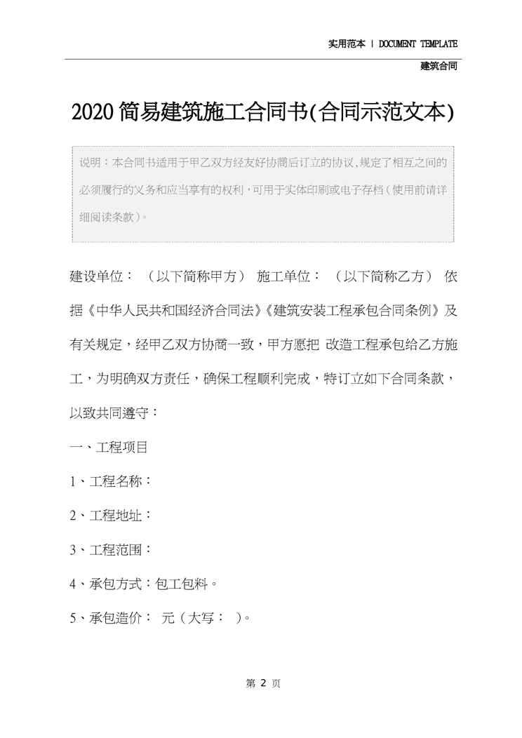 本站正式发布了《2020简易建筑施工合同书(合同示范文本)》文档,文档详细内容可下载阅读。 声明:本站所有文章,如无特殊说明或标注,均为本站原创发布。任何个人或组织,在未征得本站同意时,禁止复制、盗用、采集、发布本站内容到任何网站、书籍等各类媒体平台。如若本站内容侵犯了原著者的合法权益,可联系我们进行处理。