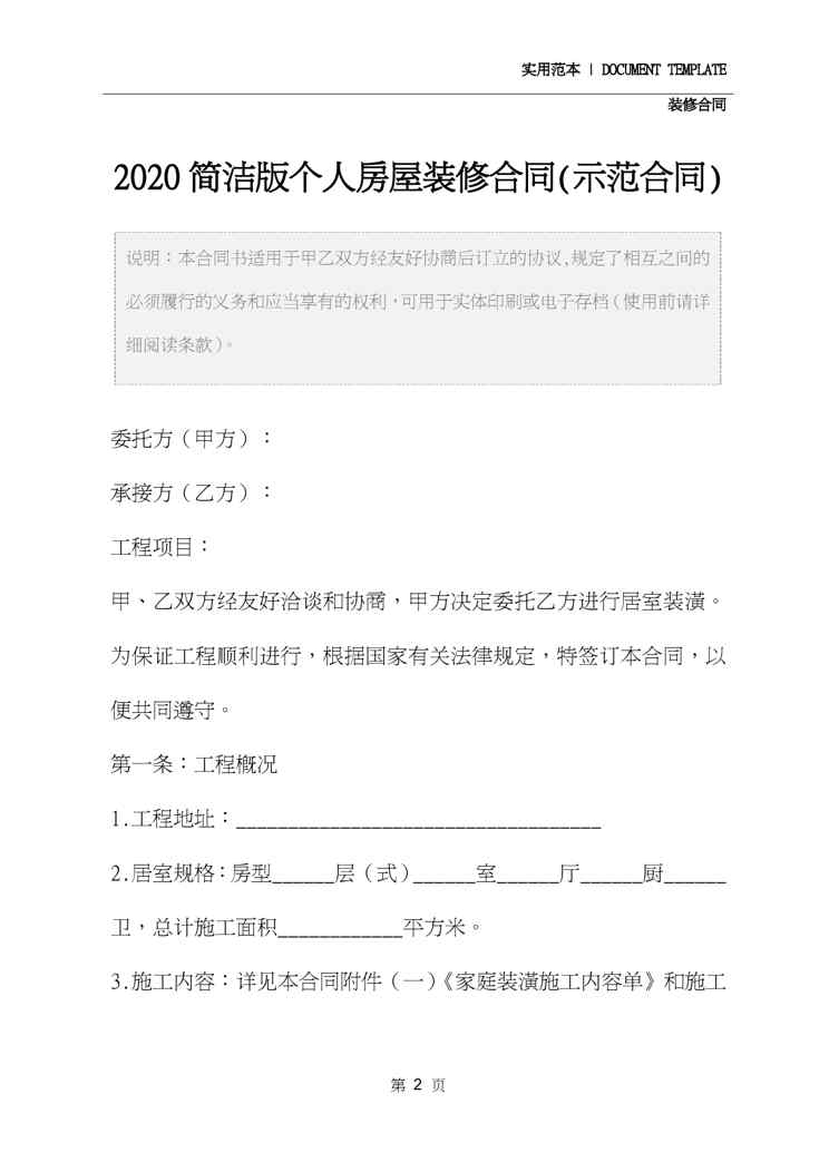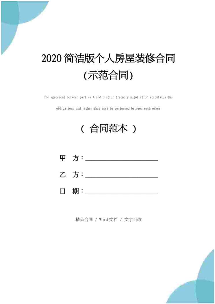 不久前,最新文档《2020简洁版个人房屋装修合同(示范合同)》全文正式在本站发布,感兴趣的用户可以下载阅读。 声明:本站所有文章,如无特殊说明或标注,均为本站原创发布。任何个人或组织,在未征得本站同意时,禁止复制、盗用、采集、发布本站内容到任何网站、书籍等各类媒体平台。如若本站内容侵犯了原著者的合法权益,可联系我们进行处理。