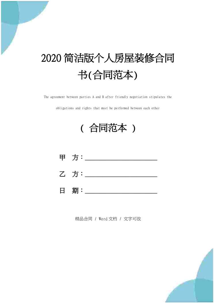 不久前,最新文档《2020简洁版个人房屋装修合同书(合同范本)》全文正式在本站发布,感兴趣的用户可以下载阅读。 声明:本站所有文章,如无特殊说明或标注,均为本站原创发布。任何个人或组织,在未征得本站同意时,禁止复制、盗用、采集、发布本站内容到任何网站、书籍等各类媒体平台。如若本站内容侵犯了原著者的合法权益,可联系我们进行处理。