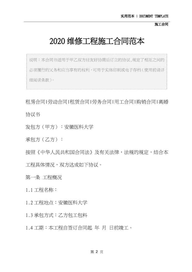 不久前,最新文档《2020维修工程施工合同范本》全文正式在本站发布,感兴趣的用户可以下载阅读。 声明:本站所有文章,如无特殊说明或标注,均为本站原创发布。任何个人或组织,在未征得本站同意时,禁止复制、盗用、采集、发布本站内容到任何网站、书籍等各类媒体平台。如若本站内容侵犯了原著者的合法权益,可联系我们进行处理。