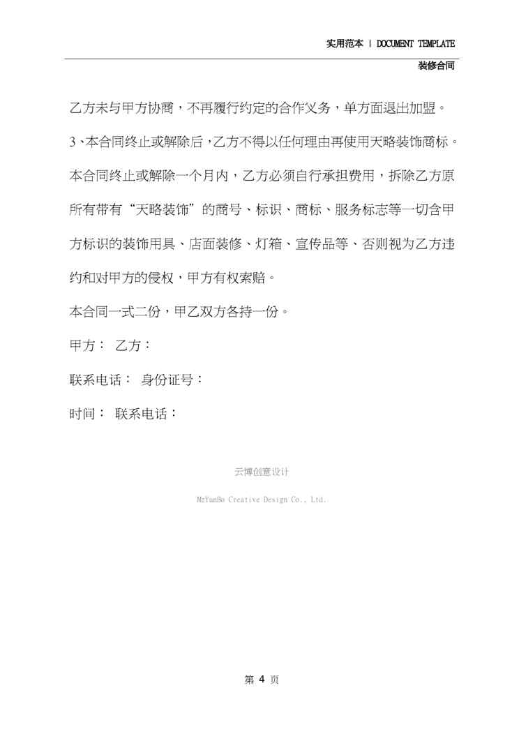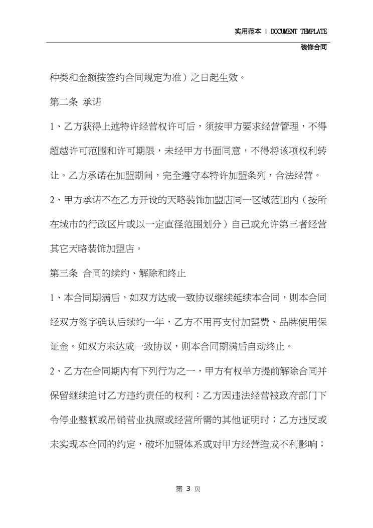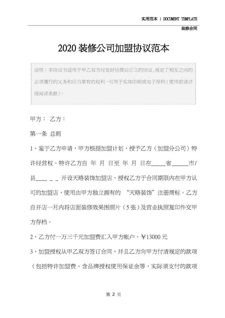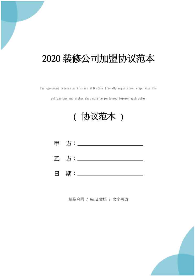 不久前,最新文档《2020装修公司加盟协议范本》全文正式在本站发布,感兴趣的用户可以下载阅读。 声明:本站所有文章,如无特殊说明或标注,均为本站原创发布。任何个人或组织,在未征得本站同意时,禁止复制、盗用、采集、发布本站内容到任何网站、书籍等各类媒体平台。如若本站内容侵犯了原著者的合法权益,可联系我们进行处理。