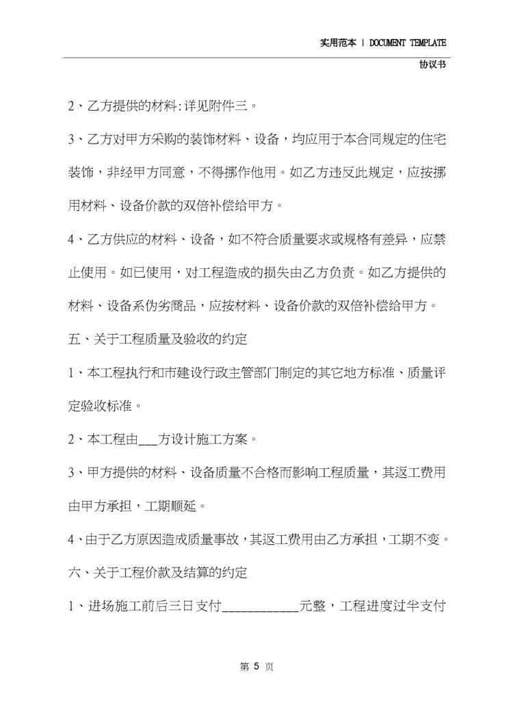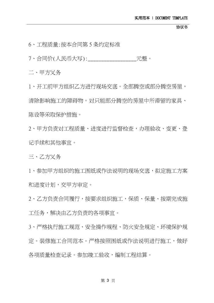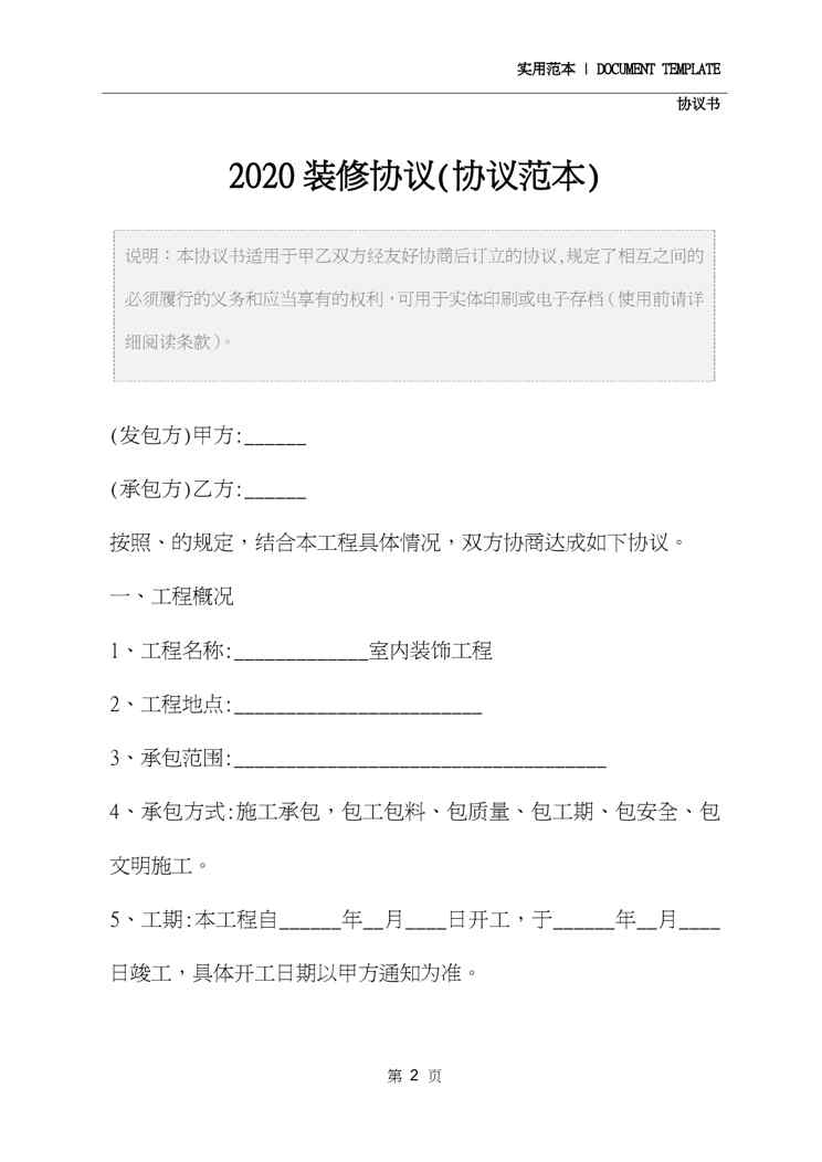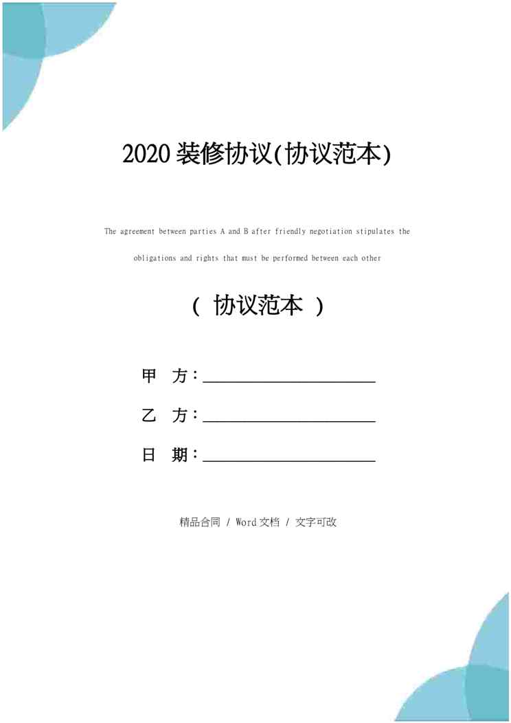 本站资深用户发布了最新的《2020装修协议(协议范本)》文档,以下内容为预览,详细内容可下载阅读。 声明:本站所有文章,如无特殊说明或标注,均为本站原创发布。任何个人或组织,在未征得本站同意时,禁止复制、盗用、采集、发布本站内容到任何网站、书籍等各类媒体平台。如若本站内容侵犯了原著者的合法权益,可联系我们进行处理。