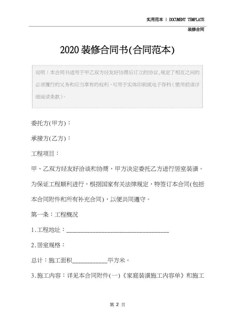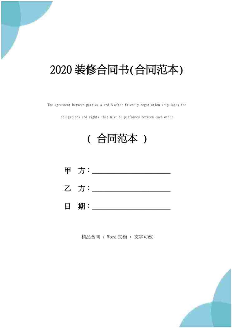 本站资深用户发布了最新的《2020装修合同书(合同范本)》文档,以下内容为预览,详细内容可下载阅读。 声明:本站所有文章,如无特殊说明或标注,均为本站原创发布。任何个人或组织,在未征得本站同意时,禁止复制、盗用、采集、发布本站内容到任何网站、书籍等各类媒体平台。如若本站内容侵犯了原著者的合法权益,可联系我们进行处理。