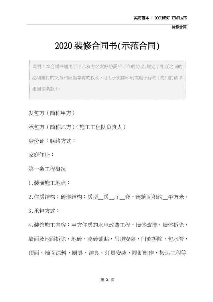 本站正式发布了《2020装修合同书(示范合同)》文档,文档详细内容可下载阅读。 声明:本站所有文章,如无特殊说明或标注,均为本站原创发布。任何个人或组织,在未征得本站同意时,禁止复制、盗用、采集、发布本站内容到任何网站、书籍等各类媒体平台。如若本站内容侵犯了原著者的合法权益,可联系我们进行处理。