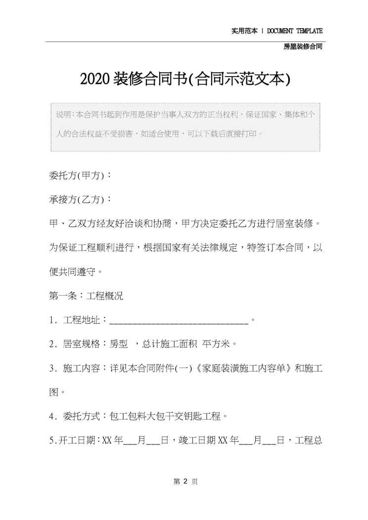 本站资深用户发布了最新的《2020装修合同书通用版》文档,以下内容为预览,详细内容可下载阅读。 声明:本站所有文章,如无特殊说明或标注,均为本站原创发布。任何个人或组织,在未征得本站同意时,禁止复制、盗用、采集、发布本站内容到任何网站、书籍等各类媒体平台。如若本站内容侵犯了原著者的合法权益,可联系我们进行处理。