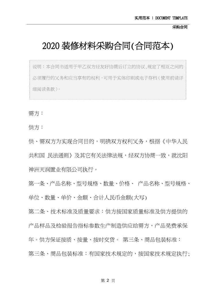 不久前,最新文档《2020装修材料采购合同(合同范本)》全文正式在本站发布,感兴趣的用户可以下载阅读。 声明:本站所有文章,如无特殊说明或标注,均为本站原创发布。任何个人或组织,在未征得本站同意时,禁止复制、盗用、采集、发布本站内容到任何网站、书籍等各类媒体平台。如若本站内容侵犯了原著者的合法权益,可联系我们进行处理。