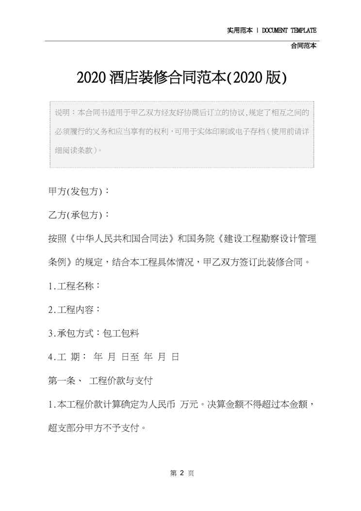 本站正式发布了《2020酒店装修合同范本(2020版)》文档,文档详细内容可下载阅读。 声明:本站所有文章,如无特殊说明或标注,均为本站原创发布。任何个人或组织,在未征得本站同意时,禁止复制、盗用、采集、发布本站内容到任何网站、书籍等各类媒体平台。如若本站内容侵犯了原著者的合法权益,可联系我们进行处理。