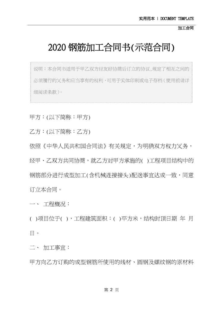 不久前,最新文档《2020钢筋加工合同书(示范合同)》全文正式在本站发布,感兴趣的用户可以下载阅读。 声明:本站所有文章,如无特殊说明或标注,均为本站原创发布。任何个人或组织,在未征得本站同意时,禁止复制、盗用、采集、发布本站内容到任何网站、书籍等各类媒体平台。如若本站内容侵犯了原著者的合法权益,可联系我们进行处理。