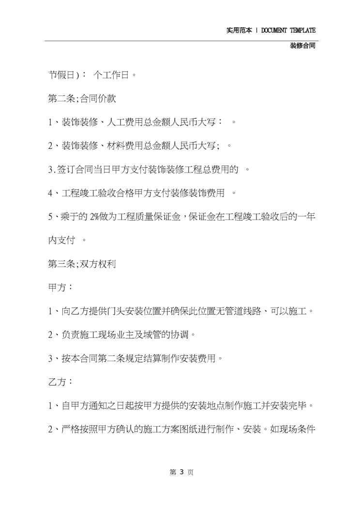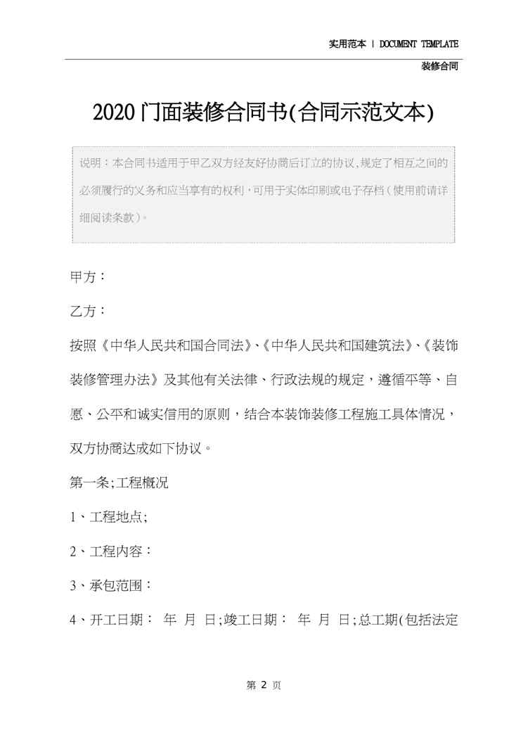 本站正式发布了《2020门面装修合同书(合同示范文本)》文档,文档详细内容可下载阅读。 声明:本站所有文章,如无特殊说明或标注,均为本站原创发布。任何个人或组织,在未征得本站同意时,禁止复制、盗用、采集、发布本站内容到任何网站、书籍等各类媒体平台。如若本站内容侵犯了原著者的合法权益,可联系我们进行处理。