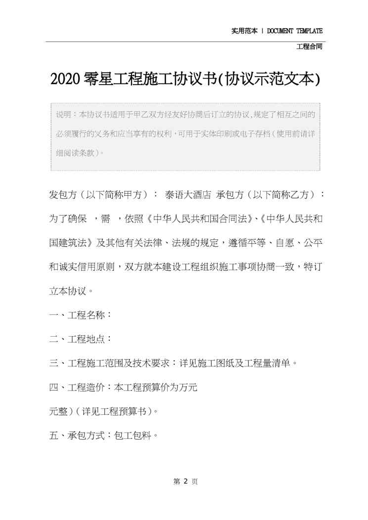 本站资深用户发布了最新的《2020零星工程施工协议书(协议示范文本)》文档,以下内容为预览,详细内容可下载阅读。 声明:本站所有文章,如无特殊说明或标注,均为本站原创发布。任何个人或组织,在未征得本站同意时,禁止复制、盗用、采集、发布本站内容到任何网站、书籍等各类媒体平台。如若本站内容侵犯了原著者的合法权益,可联系我们进行处理。