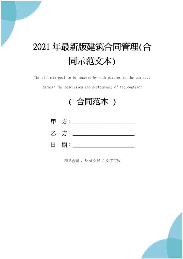 不久前,最新文档《2021年最新版建筑合同管理(合同示范文本)》全文正式在本站发布,感兴趣的用户可以下载阅读。 声明:本站所有文章,如无特殊说明或标注,均为本站原创发布。任何个人或组织,在未征得本站同意时,禁止复制、盗用、采集、发布本站内容到任何网站、书籍等各类媒体平台。如若本站内容侵犯了原著者的合法权益,可联系我们进行处理。