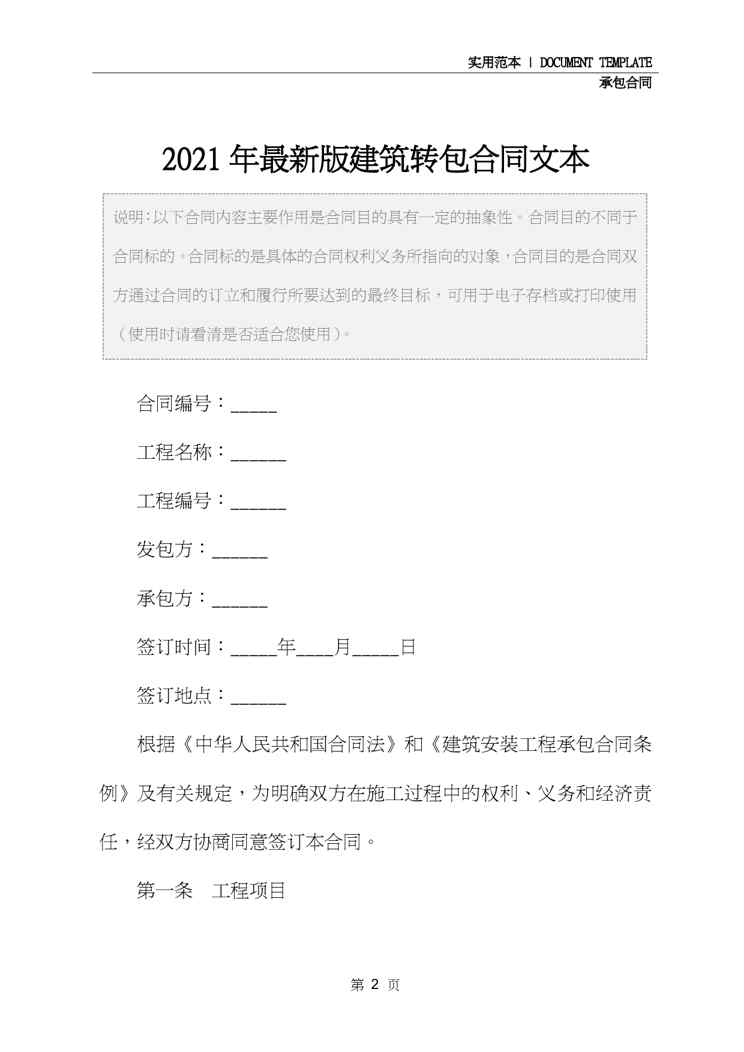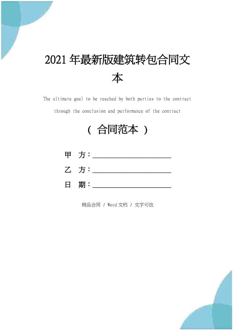 本站正式发布了《2021年最新版建筑转包合同文本》文档,文档详细内容可下载阅读。 声明:本站所有文章,如无特殊说明或标注,均为本站原创发布。任何个人或组织,在未征得本站同意时,禁止复制、盗用、采集、发布本站内容到任何网站、书籍等各类媒体平台。如若本站内容侵犯了原著者的合法权益,可联系我们进行处理。