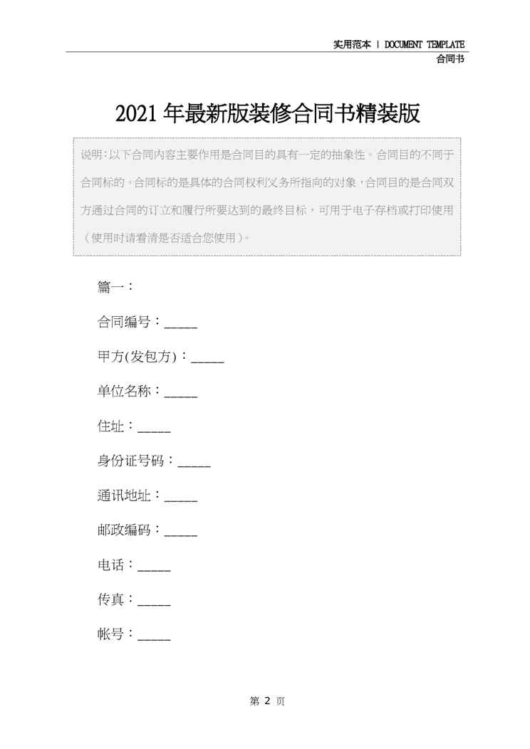 本站资深用户发布了最新的《2021年最新版装修合同书精装版》文档,以下内容为预览,详细内容可下载阅读。 声明:本站所有文章,如无特殊说明或标注,均为本站原创发布。任何个人或组织,在未征得本站同意时,禁止复制、盗用、采集、发布本站内容到任何网站、书籍等各类媒体平台。如若本站内容侵犯了原著者的合法权益,可联系我们进行处理。