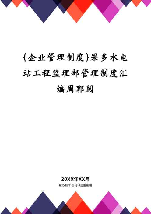 不久前,最新文档《{企业管理制度}果多水电站工程监理部管理制度汇编周郭阅》全文正式在本站发布,感兴趣的用户可以下载阅读。 声明:本站所有文章,如无特殊说明或标注,均为本站原创发布。任何个人或组织,在未征得本站同意时,禁止复制、盗用、采集、发布本站内容到任何网站、书籍等各类媒体平台。如若本站内容侵犯了原著者的合法权益,可联系我们进行处理。