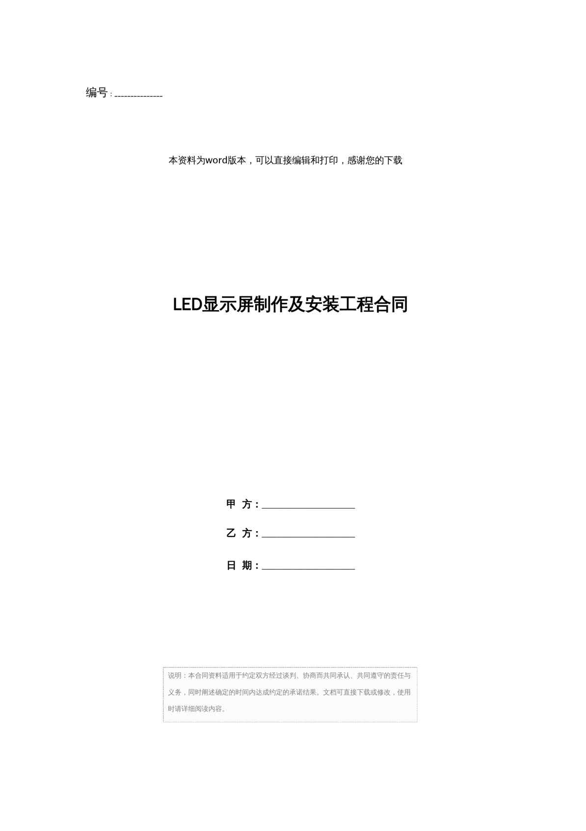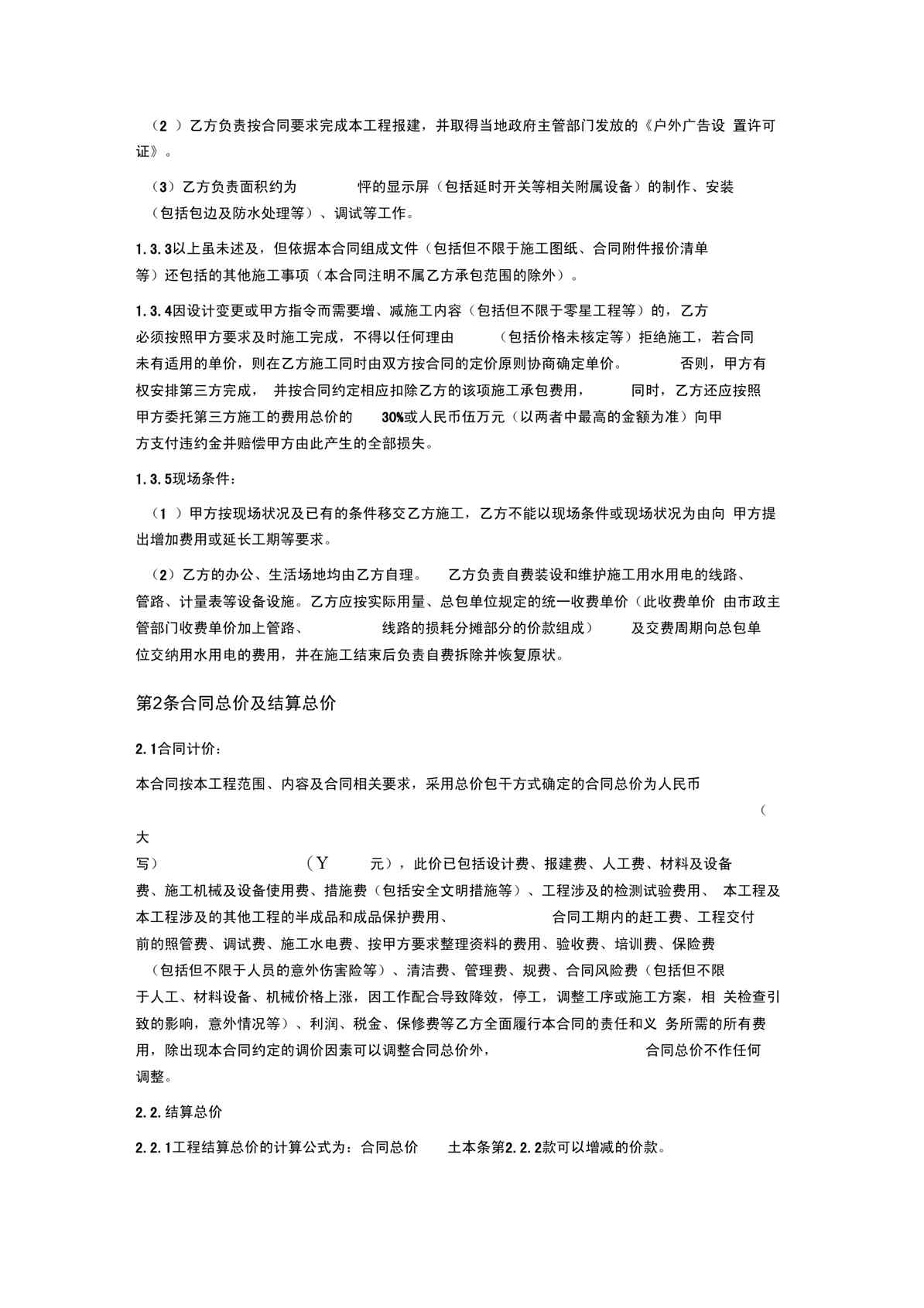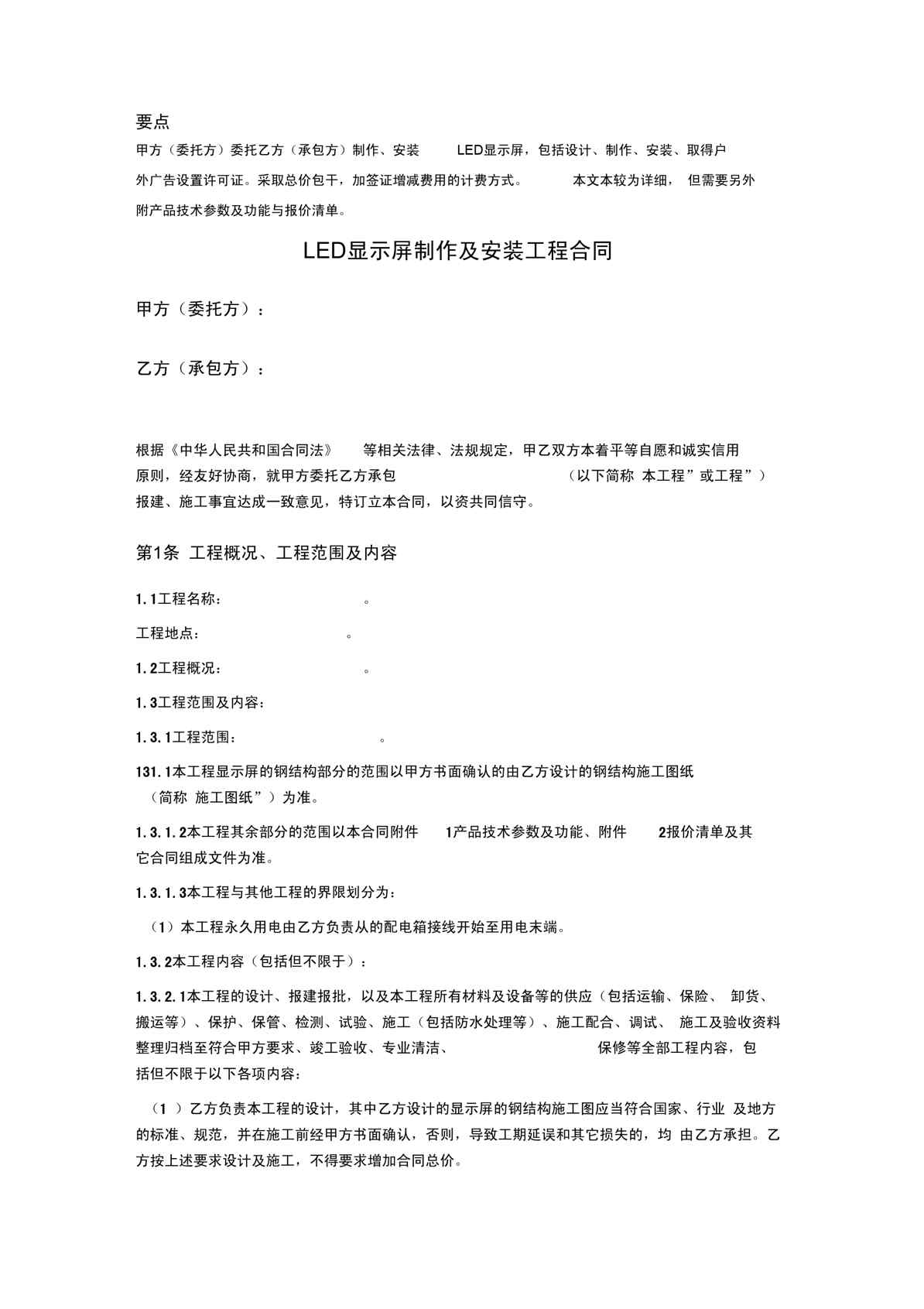 本站正式发布了《LED显示屏制作及安装工程合同》文档,文档详细内容可下载阅读。 声明:本站所有文章,如无特殊说明或标注,均为本站原创发布。任何个人或组织,在未征得本站同意时,禁止复制、盗用、采集、发布本站内容到任何网站、书籍等各类媒体平台。如若本站内容侵犯了原著者的合法权益,可联系我们进行处理。
