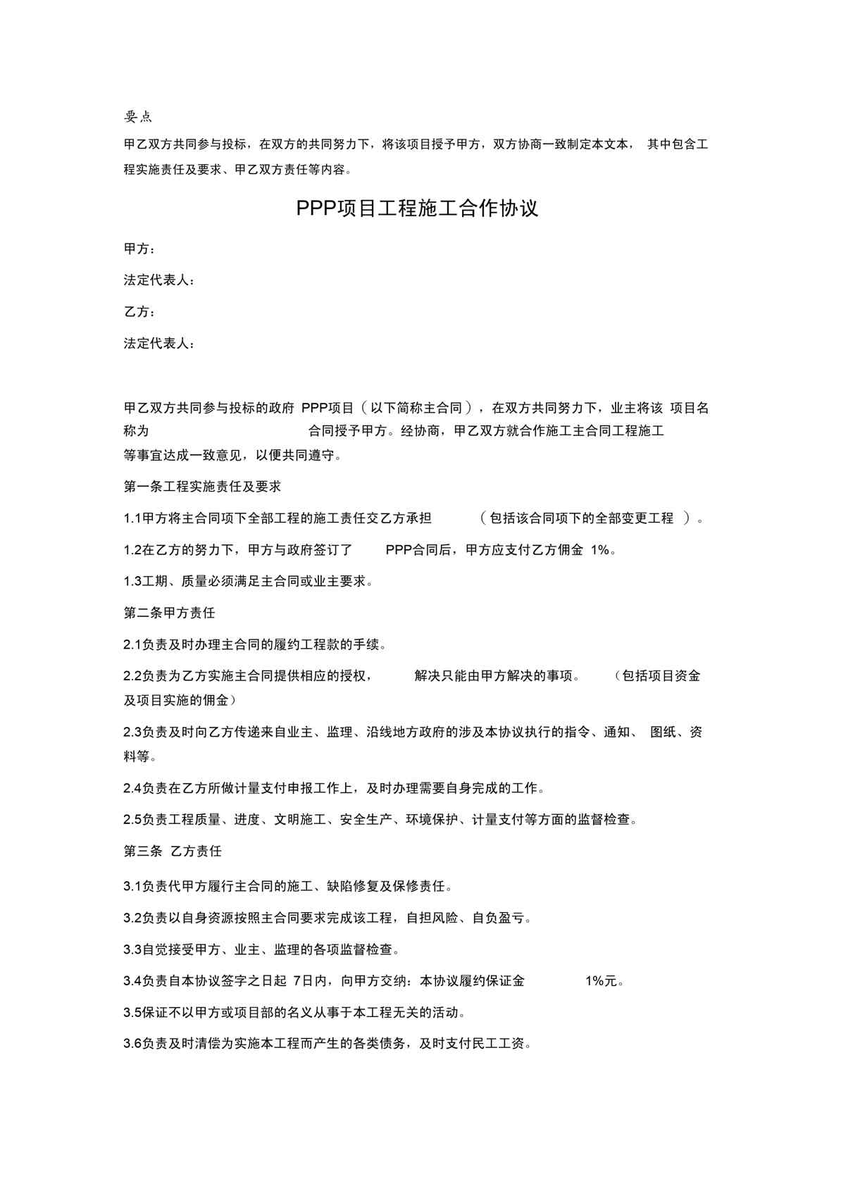 本站正式发布了《PPP项目工程施工合作协议》文档,文档详细内容可下载阅读。 声明:本站所有文章,如无特殊说明或标注,均为本站原创发布。任何个人或组织,在未征得本站同意时,禁止复制、盗用、采集、发布本站内容到任何网站、书籍等各类媒体平台。如若本站内容侵犯了原著者的合法权益,可联系我们进行处理。