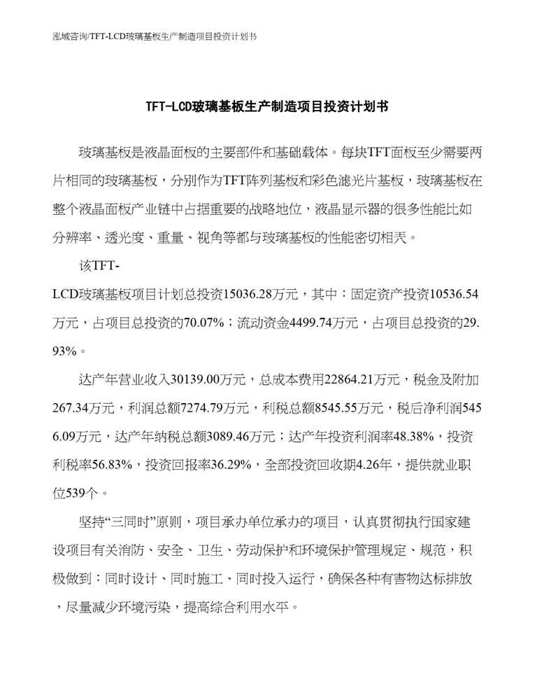 本站正式发布了《TFT-LCD玻璃基板生产制造项目投资计划书(可编辑范文模板)》文档,文档详细内容可下载阅读。 声明:本站所有文章,如无特殊说明或标注,均为本站原创发布。任何个人或组织,在未征得本站同意时,禁止复制、盗用、采集、发布本站内容到任何网站、书籍等各类媒体平台。如若本站内容侵犯了原著者的合法权益,可联系我们进行处理。