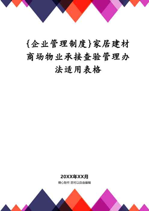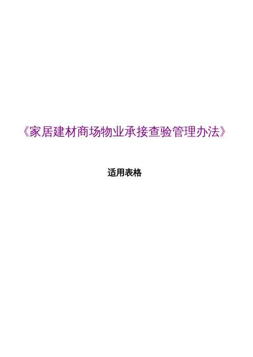 本站正式发布了《{企业管理制度}家居建材商场物业承接查验管理办法适用表格》文档,文档详细内容可下载阅读。 声明:本站所有文章,如无特殊说明或标注,均为本站原创发布。任何个人或组织,在未征得本站同意时,禁止复制、盗用、采集、发布本站内容到任何网站、书籍等各类媒体平台。如若本站内容侵犯了原著者的合法权益,可联系我们进行处理。