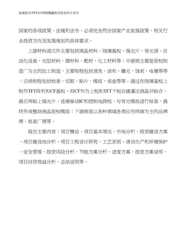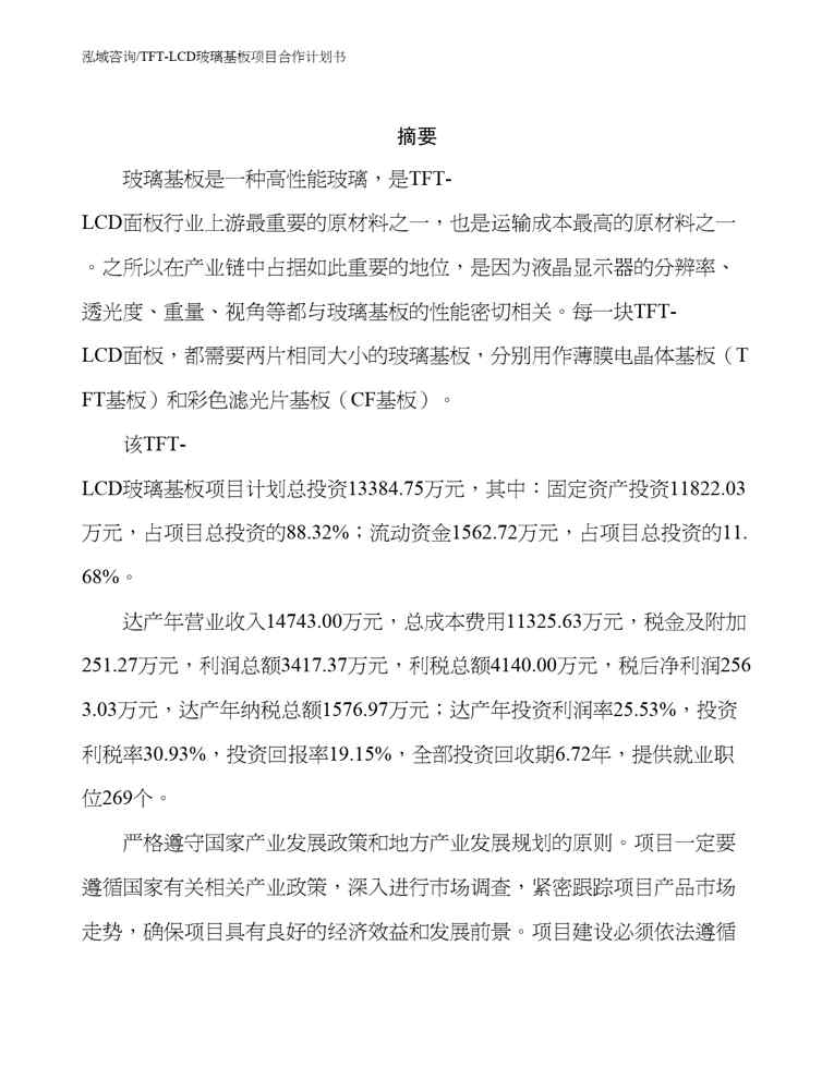 本站资深用户发布了最新的《TFT-LCD玻璃基板项目合作计划书范文模板》文档,以下内容为预览,详细内容可下载阅读。 声明:本站所有文章,如无特殊说明或标注,均为本站原创发布。任何个人或组织,在未征得本站同意时,禁止复制、盗用、采集、发布本站内容到任何网站、书籍等各类媒体平台。如若本站内容侵犯了原著者的合法权益,可联系我们进行处理。