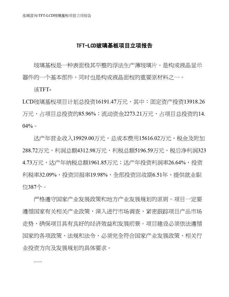 不久前,最新文档《TFT-LCD玻璃基板项目立项报告》全文正式在本站发布,感兴趣的用户可以下载阅读。 声明:本站所有文章,如无特殊说明或标注,均为本站原创发布。任何个人或组织,在未征得本站同意时,禁止复制、盗用、采集、发布本站内容到任何网站、书籍等各类媒体平台。如若本站内容侵犯了原著者的合法权益,可联系我们进行处理。
