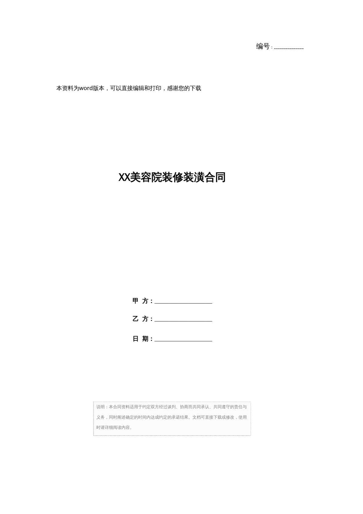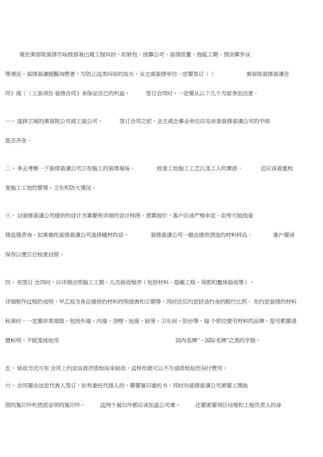 本站资深用户发布了最新的《XX美容院装修装潢合同》文档,以下内容为预览,详细内容可下载阅读。 声明:本站所有文章,如无特殊说明或标注,均为本站原创发布。任何个人或组织,在未征得本站同意时,禁止复制、盗用、采集、发布本站内容到任何网站、书籍等各类媒体平台。如若本站内容侵犯了原著者的合法权益,可联系我们进行处理。