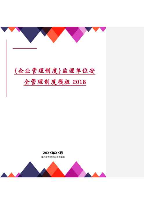 不久前,最新文档《{企业管理制度}监理单位安全管理制度模板2018.4.10》全文正式在本站发布,感兴趣的用户可以下载阅读。 声明:本站所有文章,如无特殊说明或标注,均为本站原创发布。任何个人或组织,在未征得本站同意时,禁止复制、盗用、采集、发布本站内容到任何网站、书籍等各类媒体平台。如若本站内容侵犯了原著者的合法权益,可联系我们进行处理。