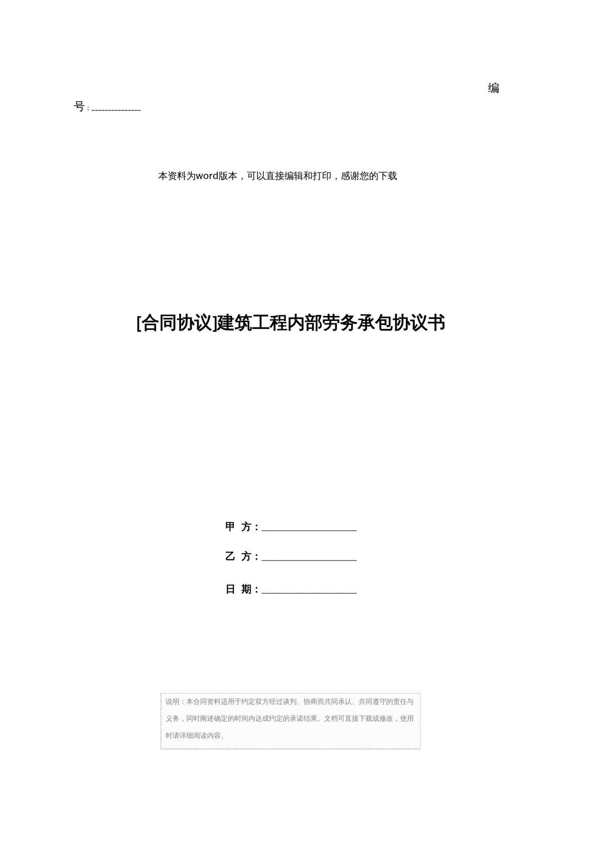 本站正式发布了《[合同协议]建筑工程内部劳务承包协议书》文档,文档详细内容可下载阅读。 声明:本站所有文章,如无特殊说明或标注,均为本站原创发布。任何个人或组织,在未征得本站同意时,禁止复制、盗用、采集、发布本站内容到任何网站、书籍等各类媒体平台。如若本站内容侵犯了原著者的合法权益,可联系我们进行处理。