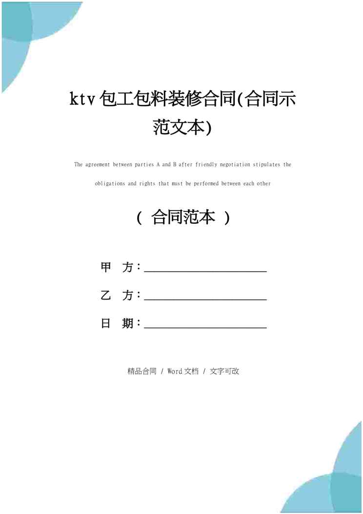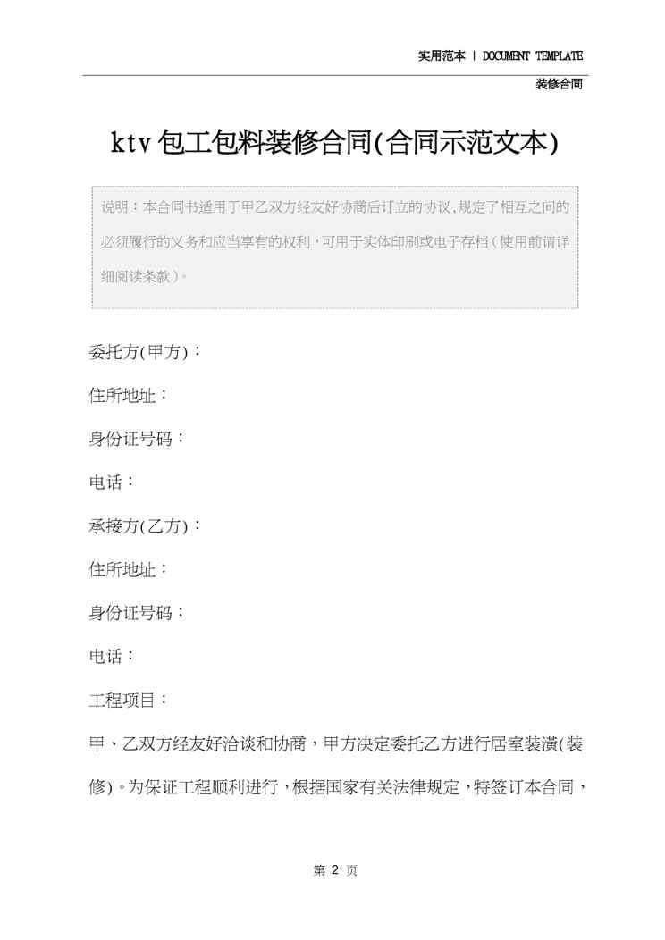 本站资深用户发布了最新的《ktv包工包料装修合同(合同示范文本)》文档,以下内容为预览,详细内容可下载阅读。 声明:本站所有文章,如无特殊说明或标注,均为本站原创发布。任何个人或组织,在未征得本站同意时,禁止复制、盗用、采集、发布本站内容到任何网站、书籍等各类媒体平台。如若本站内容侵犯了原著者的合法权益,可联系我们进行处理。