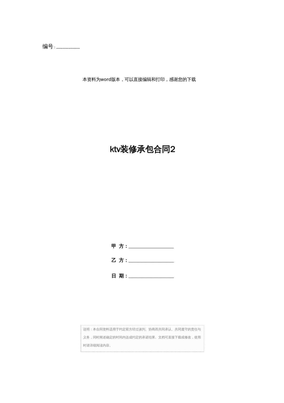 不久前,最新文档《ktv装修承包合同2》全文正式在本站发布,感兴趣的用户可以下载阅读。 声明:本站所有文章,如无特殊说明或标注,均为本站原创发布。任何个人或组织,在未征得本站同意时,禁止复制、盗用、采集、发布本站内容到任何网站、书籍等各类媒体平台。如若本站内容侵犯了原著者的合法权益,可联系我们进行处理。