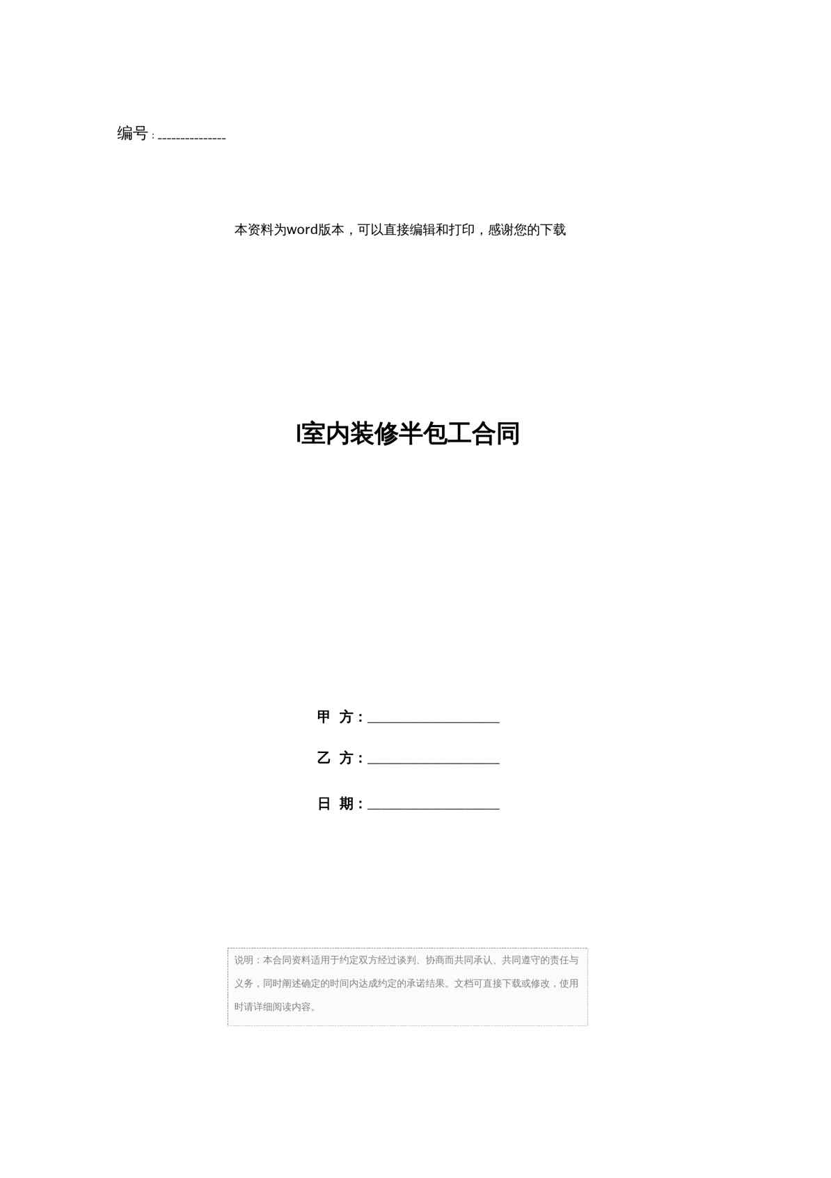 不久前,最新文档《l室内装修半包工合同》全文正式在本站发布,感兴趣的用户可以下载阅读。 声明:本站所有文章,如无特殊说明或标注,均为本站原创发布。任何个人或组织,在未征得本站同意时,禁止复制、盗用、采集、发布本站内容到任何网站、书籍等各类媒体平台。如若本站内容侵犯了原著者的合法权益,可联系我们进行处理。